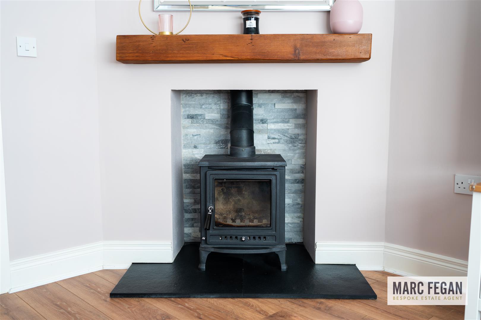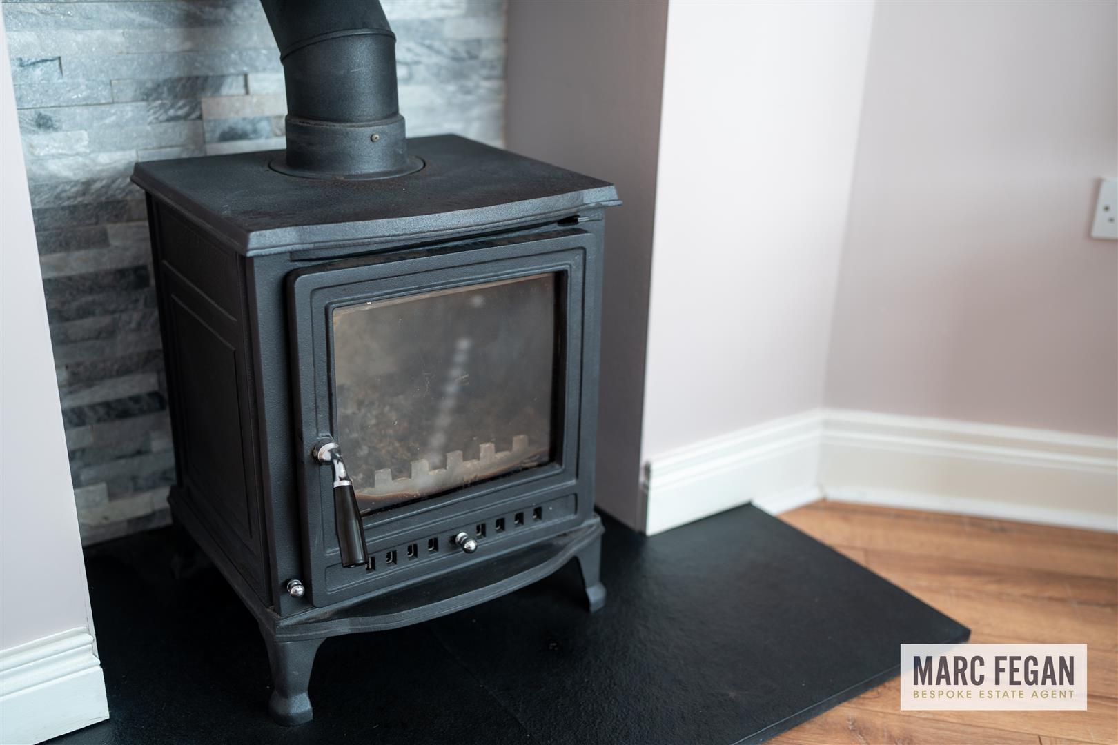 Lounge with bay window and feature wood burning stove.