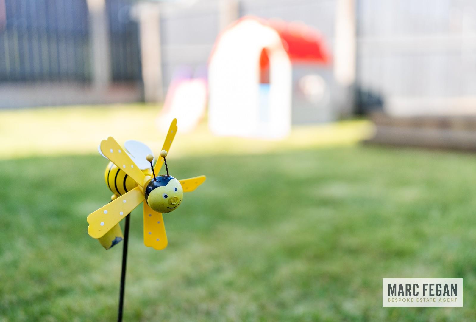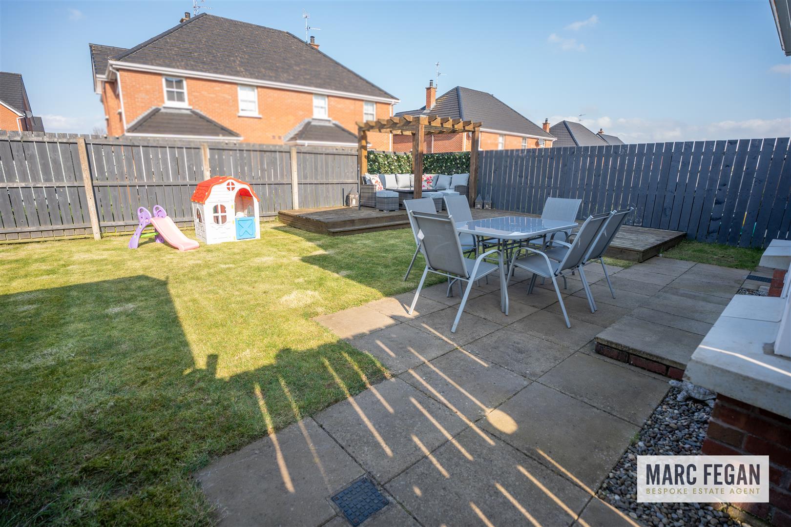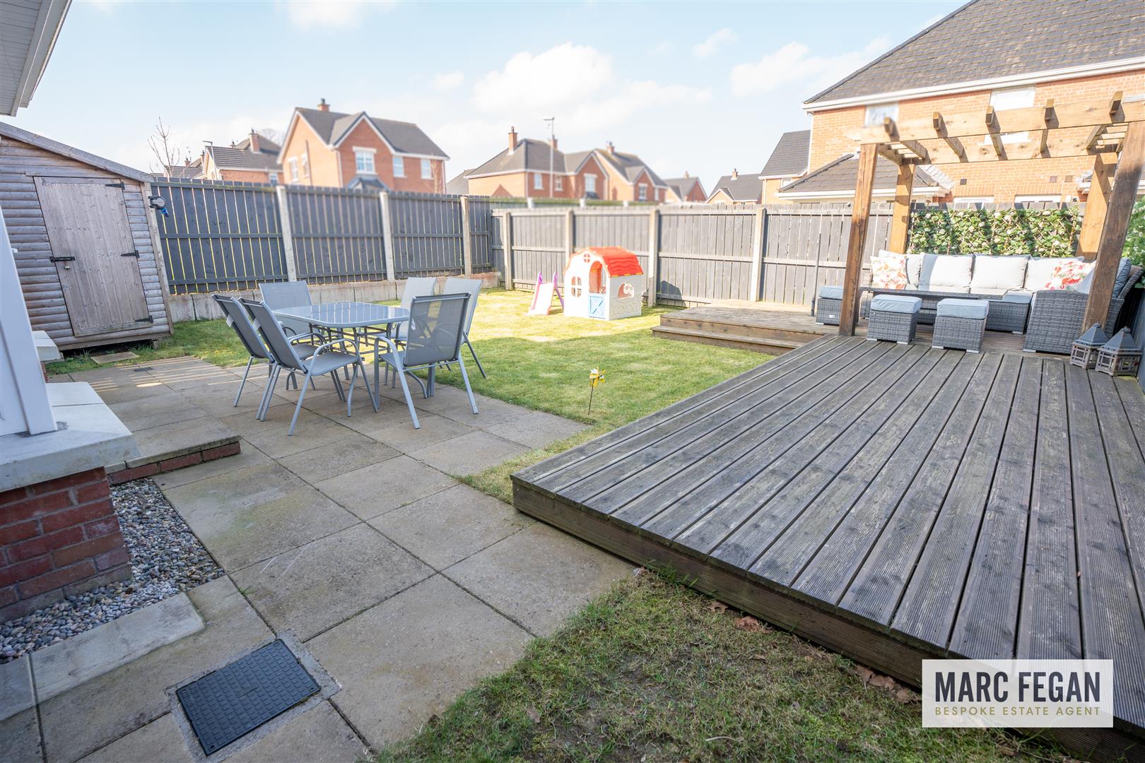 Fully enclosed, sun trap and spacious garden with lawn, patio area & feature raised decked area with pergola