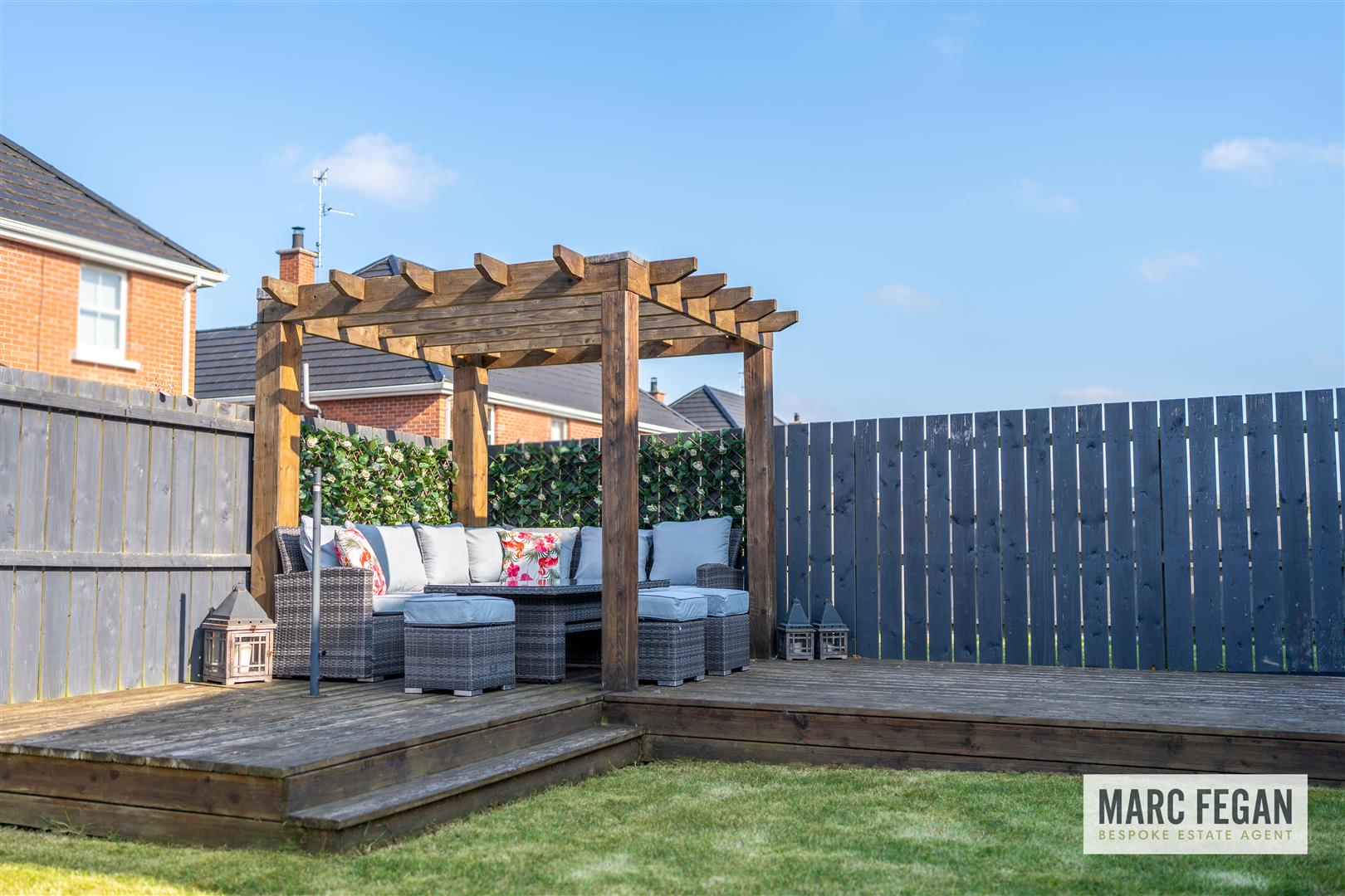 Sun Trap Garden With Lawn, Patio & Feature Raised Decked Area With Pergola