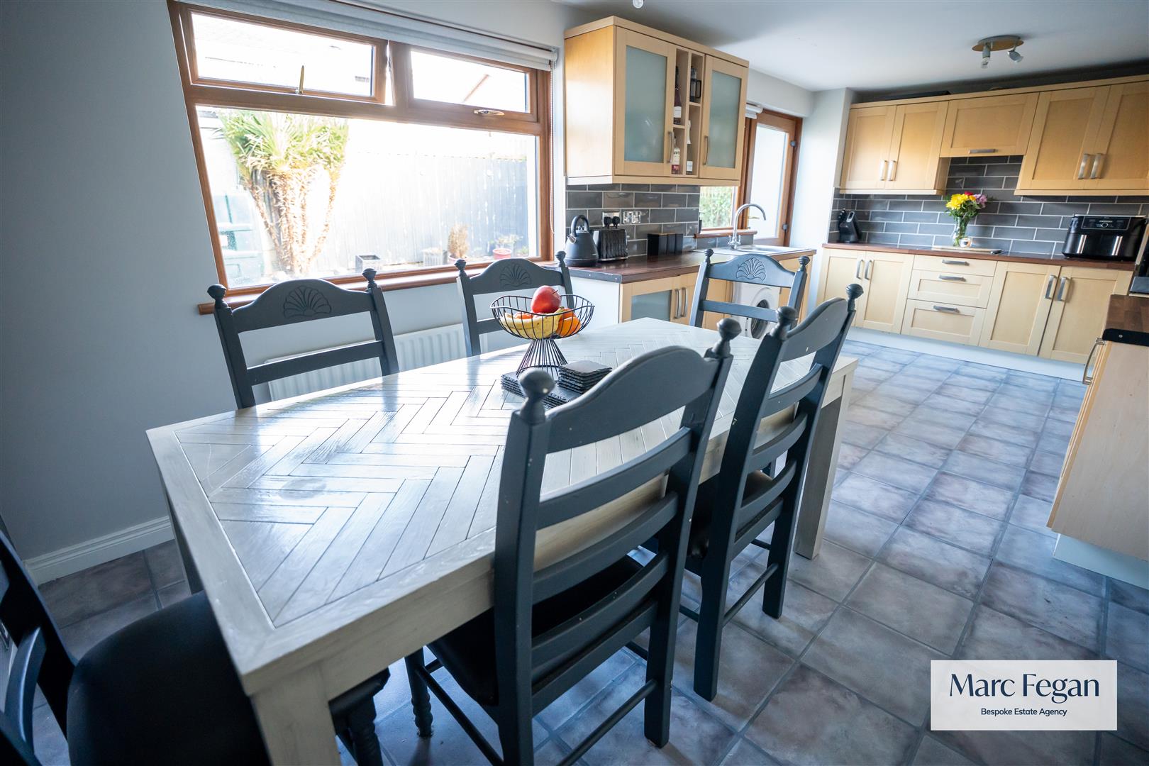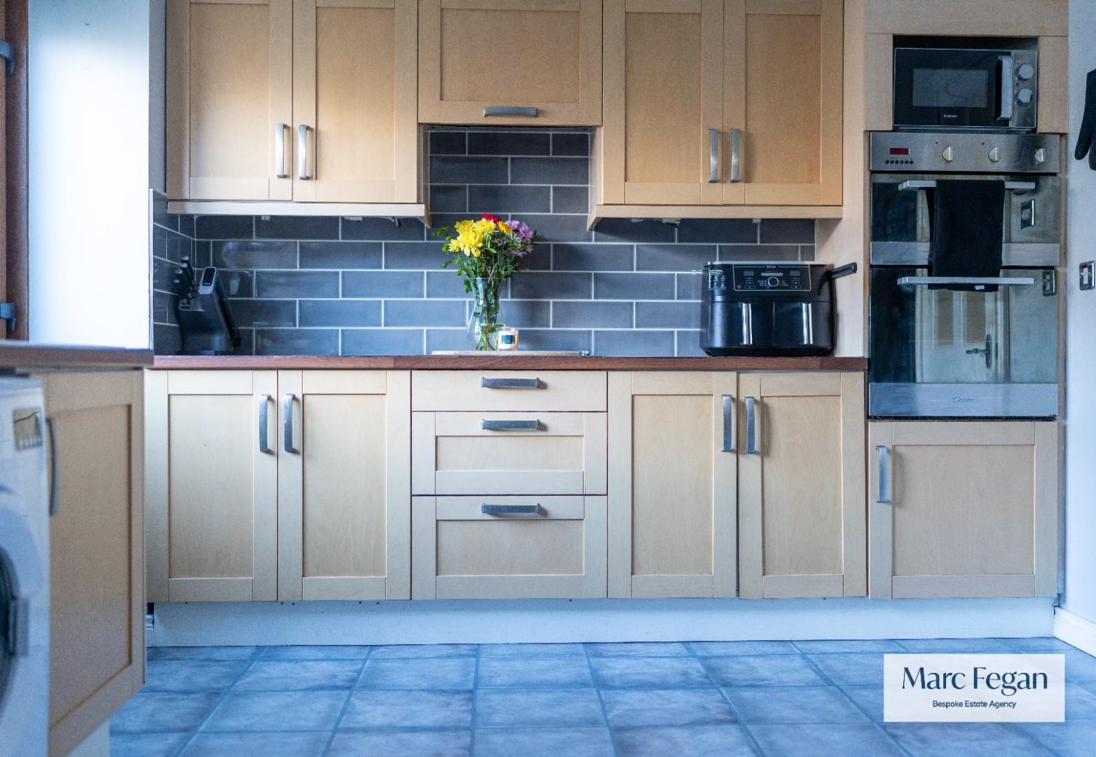 The ground floor comprises a bright and spacious lounge featuring a multi-fuel stove, along with an open plan kitchen dining area complete with integrated oven, separate hob and ample space for family dining. Oak frame PVC double glazed windows and external doors are installed throughout, complemented by oil-fired central heating.