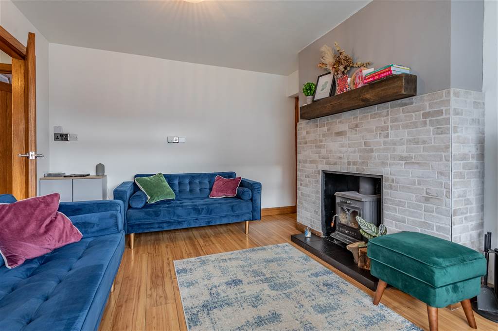 With multi-fuel burning stove to slate tiled hearth and railway sleeper style mantle. Laminated wooden flooring. Door through to kitchen/dining room.