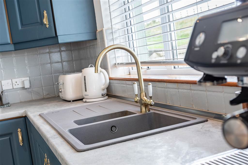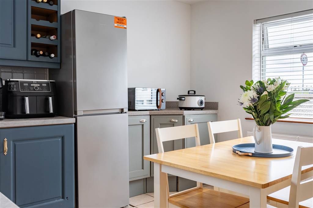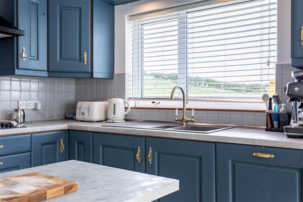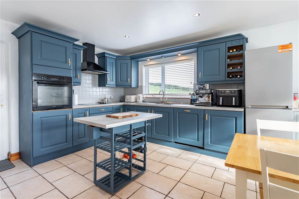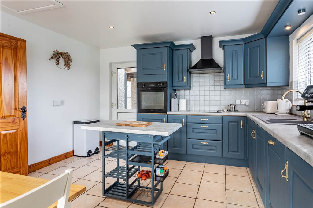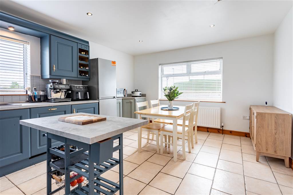 With a range of eye and low-level fitted units, 1 1/4 bowl sink unit and drainer with mixer tap. Integrated four ring electric hob with extractor fan over. Integrated oven. Integrated dishwasher. Cutlery drawer. Saucepan drawers. Wine rack. Space for fridge-freezer. Kitchen island. Spacious area for dining. Spot lighting to ceiling. Splash back tiling. Tiled flooring. Access to loft. PVC door to rear.