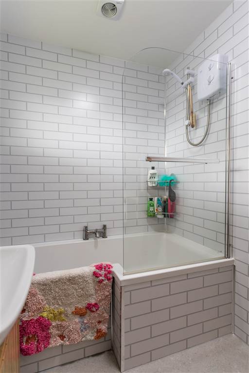 With 3-piece white suite comprising LFWC, WHB and panelled bath with shower over.