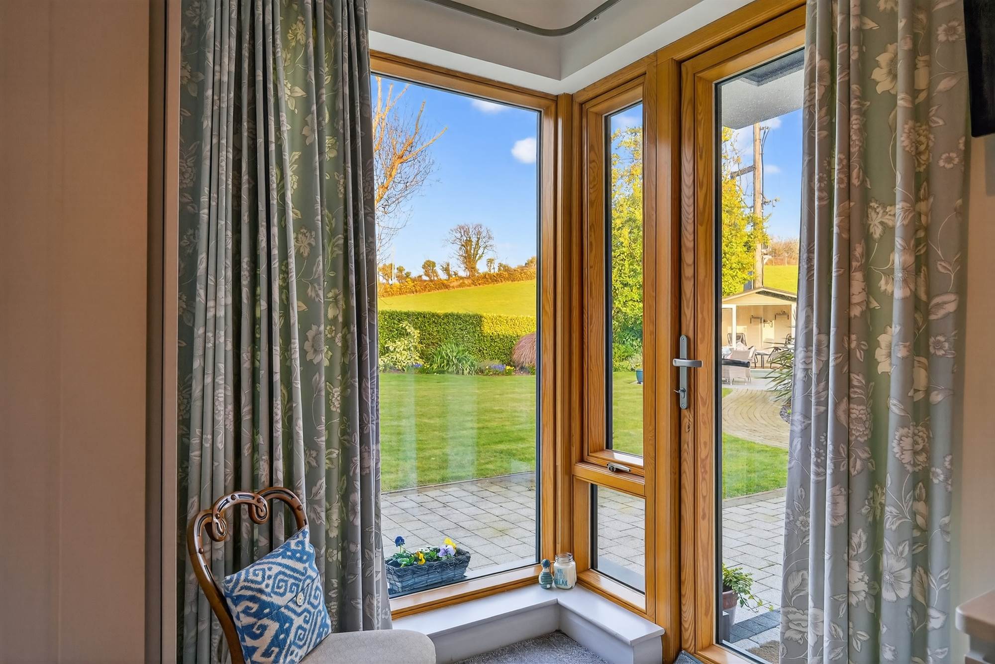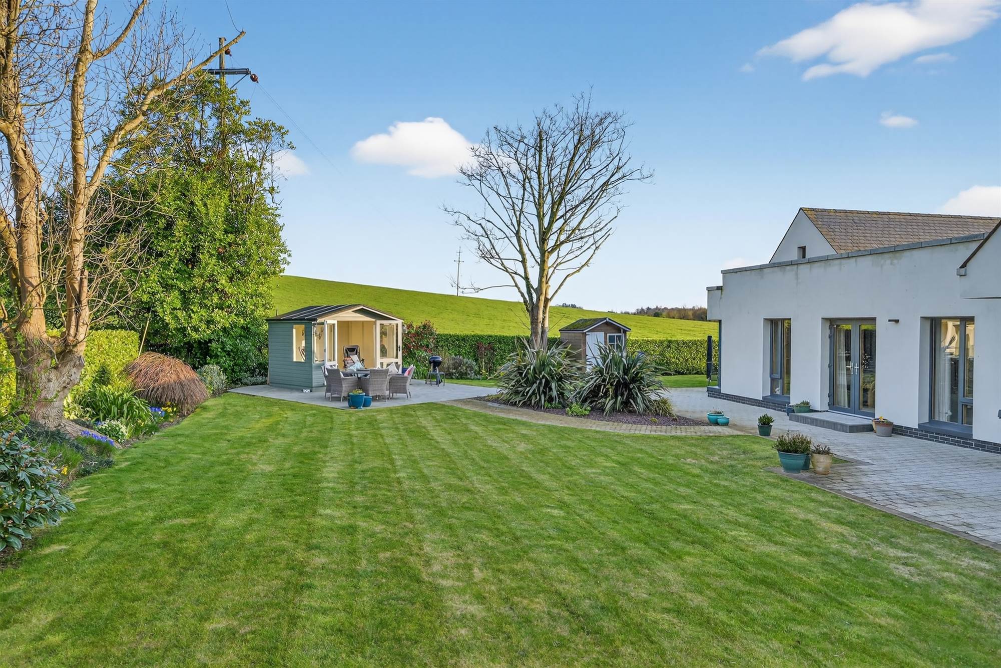 with patio area to front. Garden shed. Brick pavior patio areas which enjoy the sun throughout the day, ideal for outdoor entertaining. Landscaped gardens laid in lawn overlooking the fields, mature trees and shrubs.