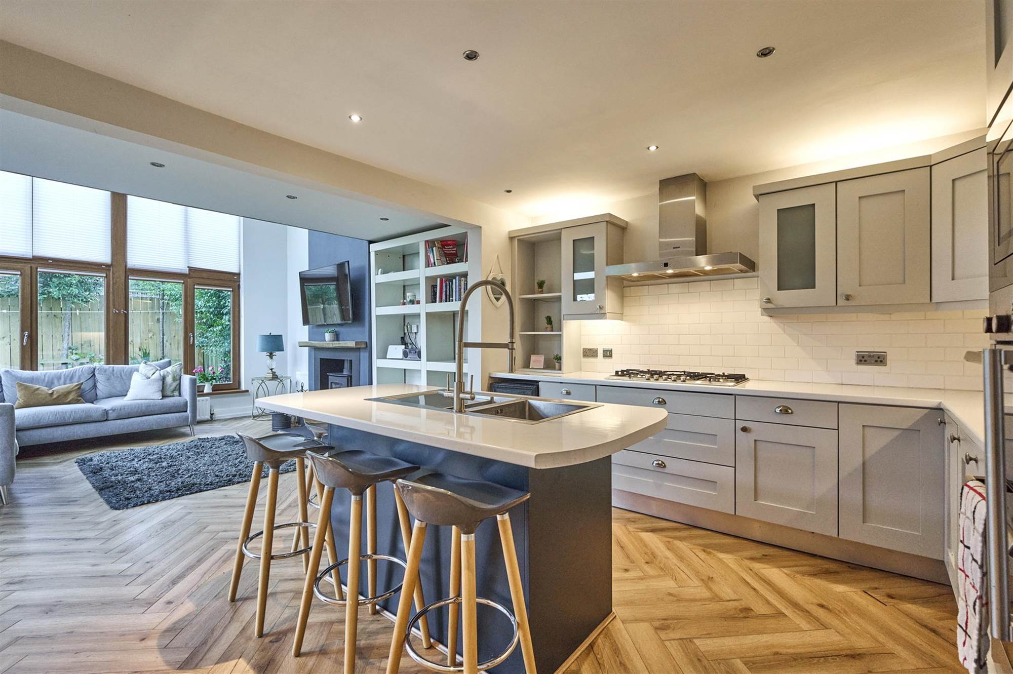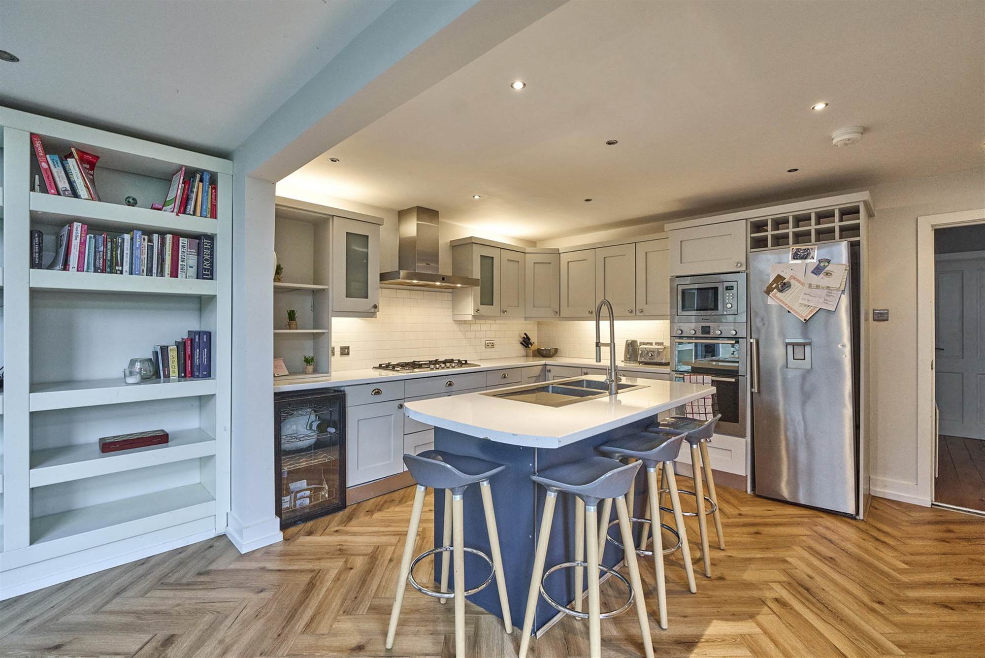 Shaker style kitchen with excellent range of high and low level units and matching island, Caple five ring gas hob, Bosch eye level oven and grill, Candy microwave, stainless steel 1.5 sink with drainer and mixer tap and detachable mixer tap, laminate worktops, feature vaulted ceiling with mezzanine overlooking wood burning stove, slate hearth, timber mantle, herringbone oak effect laminate wood floor, uPVC double glazed double doors to exterior.