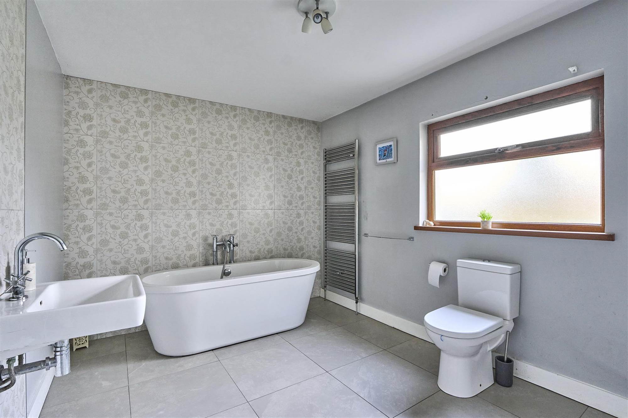 White suite comprising free standing bath with mixer tap, wall mounted wash hand basin with mixer tap, low flush wc, heated towel rail, part tiled walls, ceramic tiled floor, window.