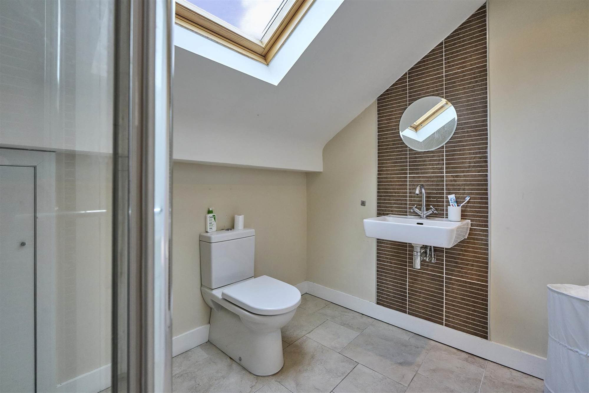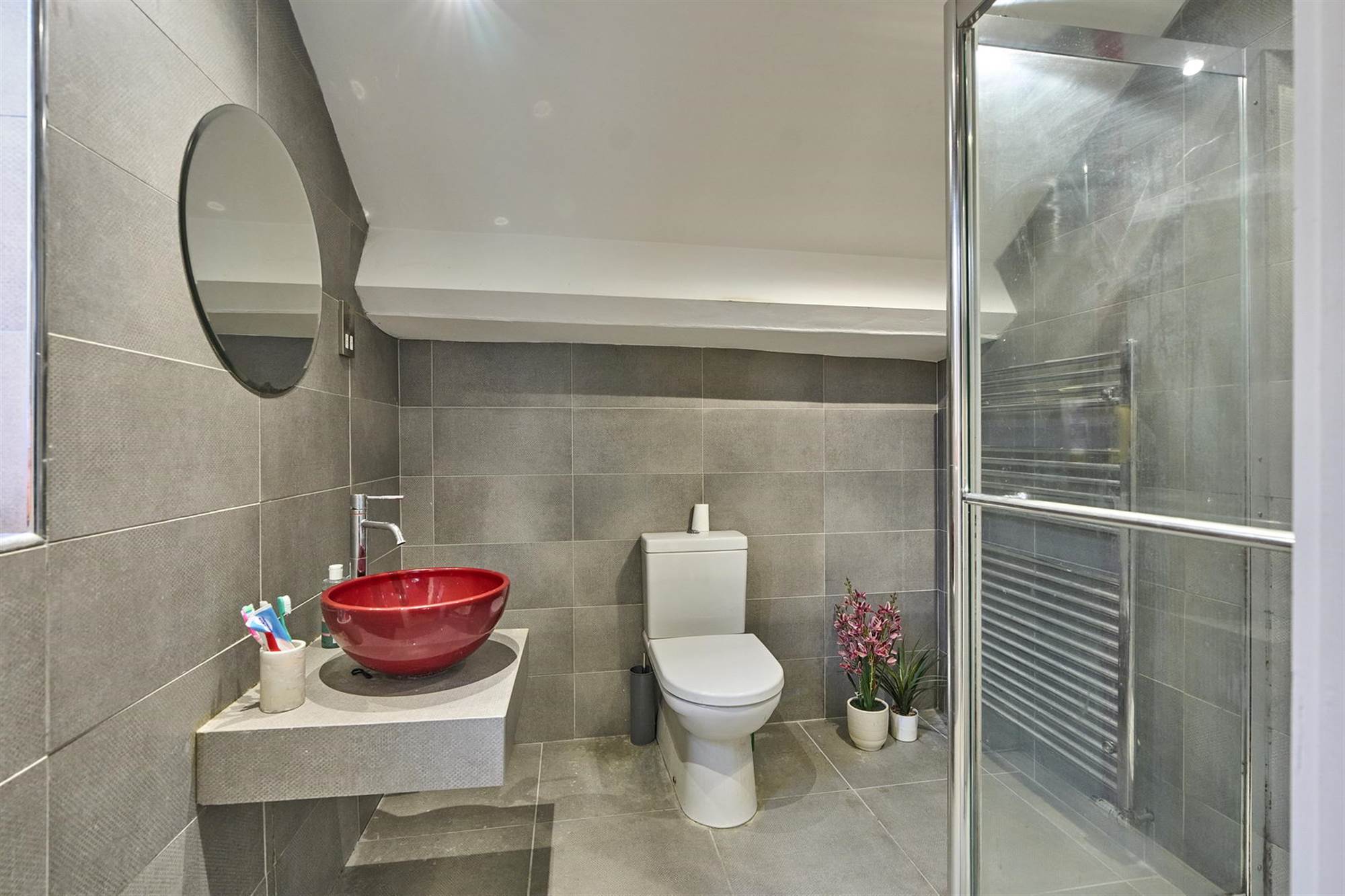 Fully tiled built-in shower cubicle with mains shower unit, low flush wc, wall mounted wash hand basin with mixer tap and tiled splashback, ceramic tiled floor, extractor fan, Velux window.