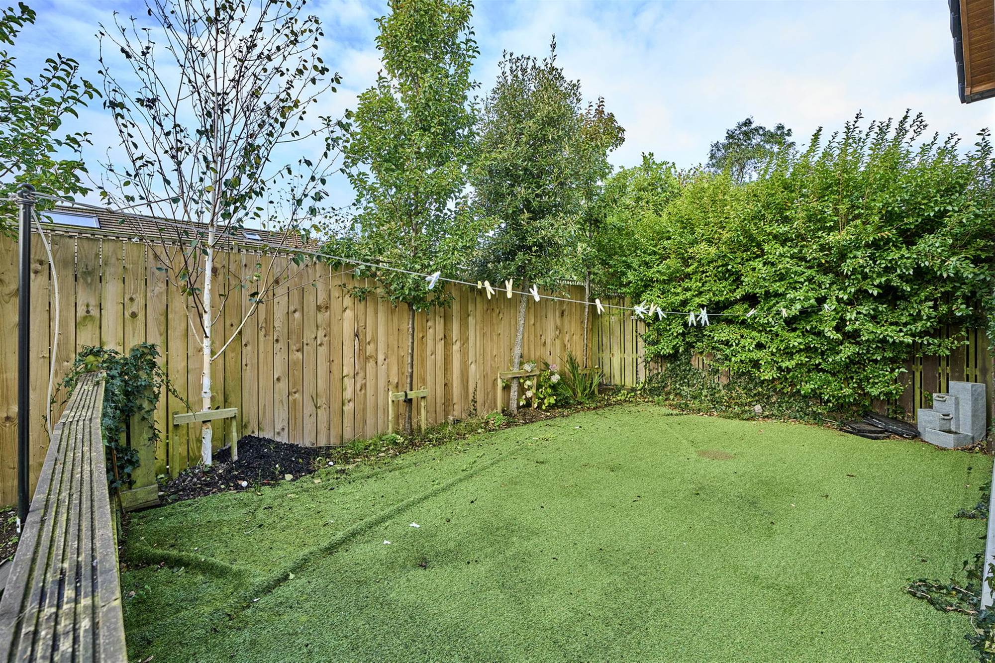 Enclosed rear garden benefitting from a sunny south-west facing aspect in lawn with timber decked area bordered by hedging and fencing.