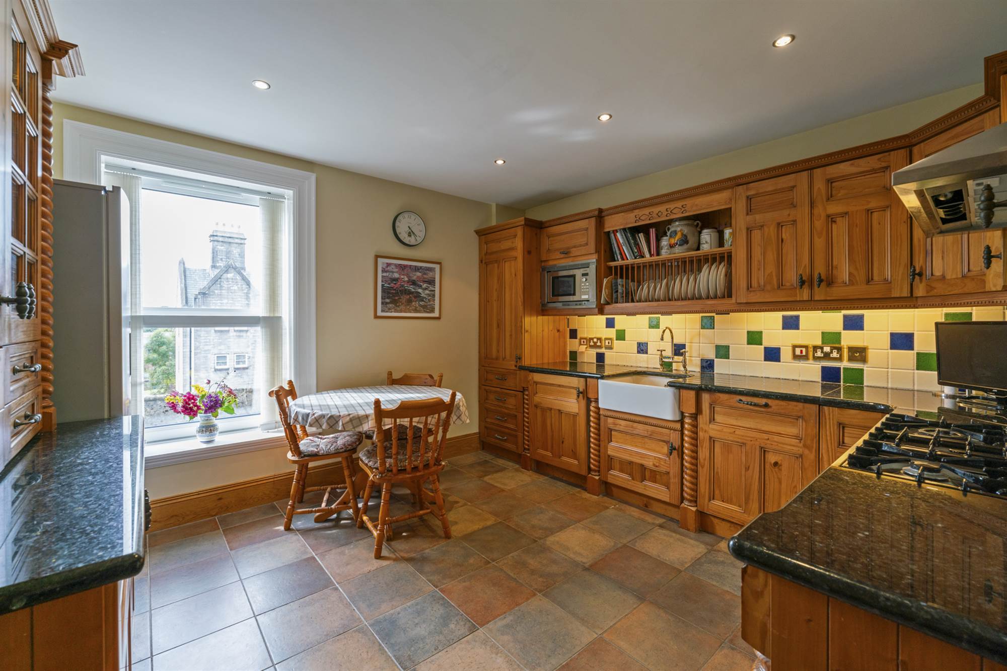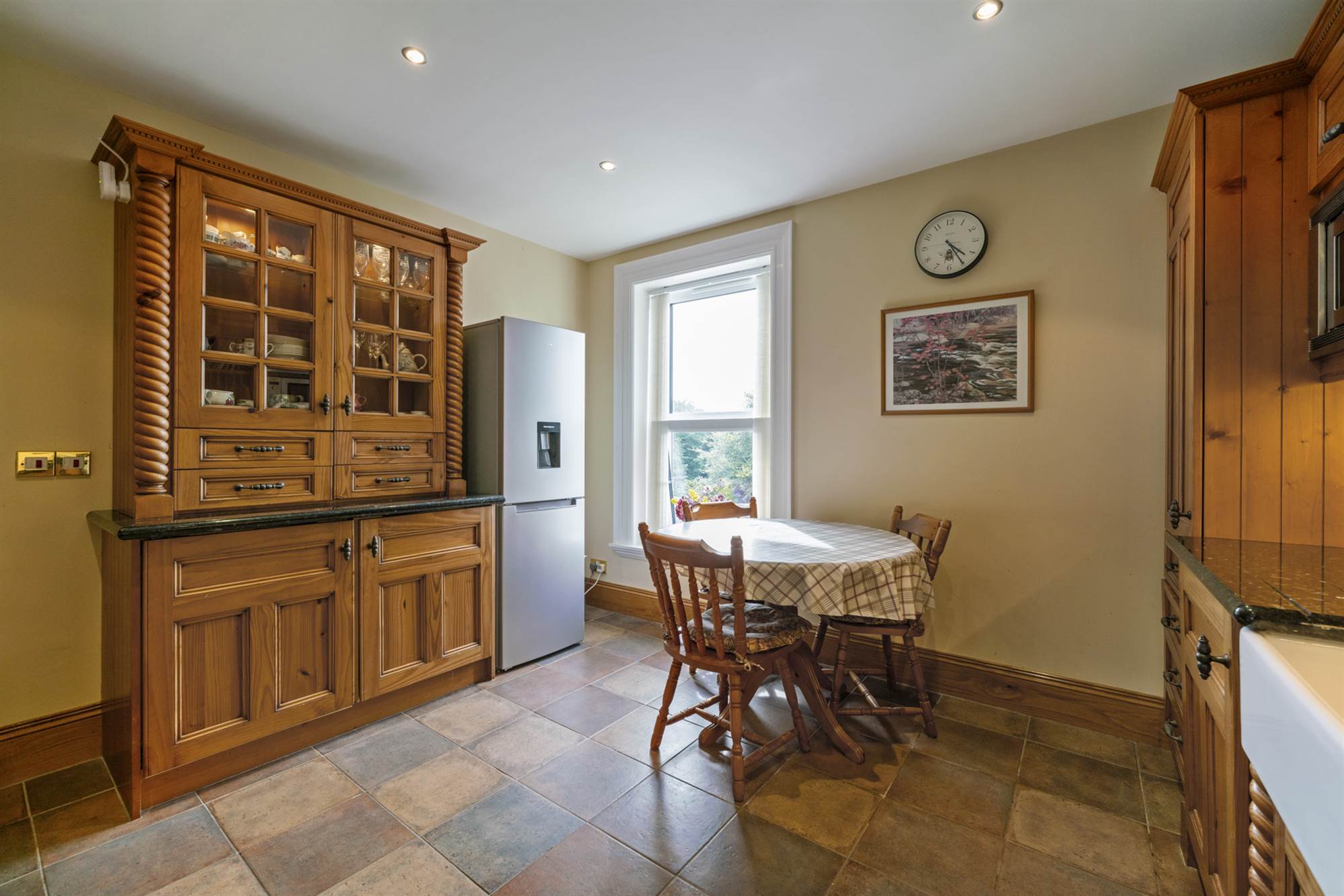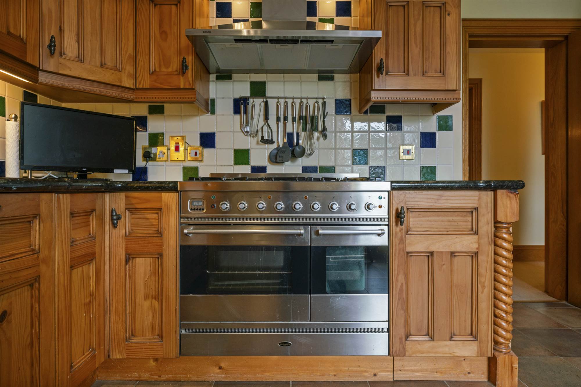 Range of high and low level oak units with granite worktops, integrated appliance include: washing machine, fridge and freezer, dishwasher, four ring gas hob with overhead stainless steel extractor hood, 'Britannia' rangemaster oven, eye level microwave, space for American style fridge freezer, sink unit with mixer tap, partly tiled walls, ceramic tiled floor, casual dining space.