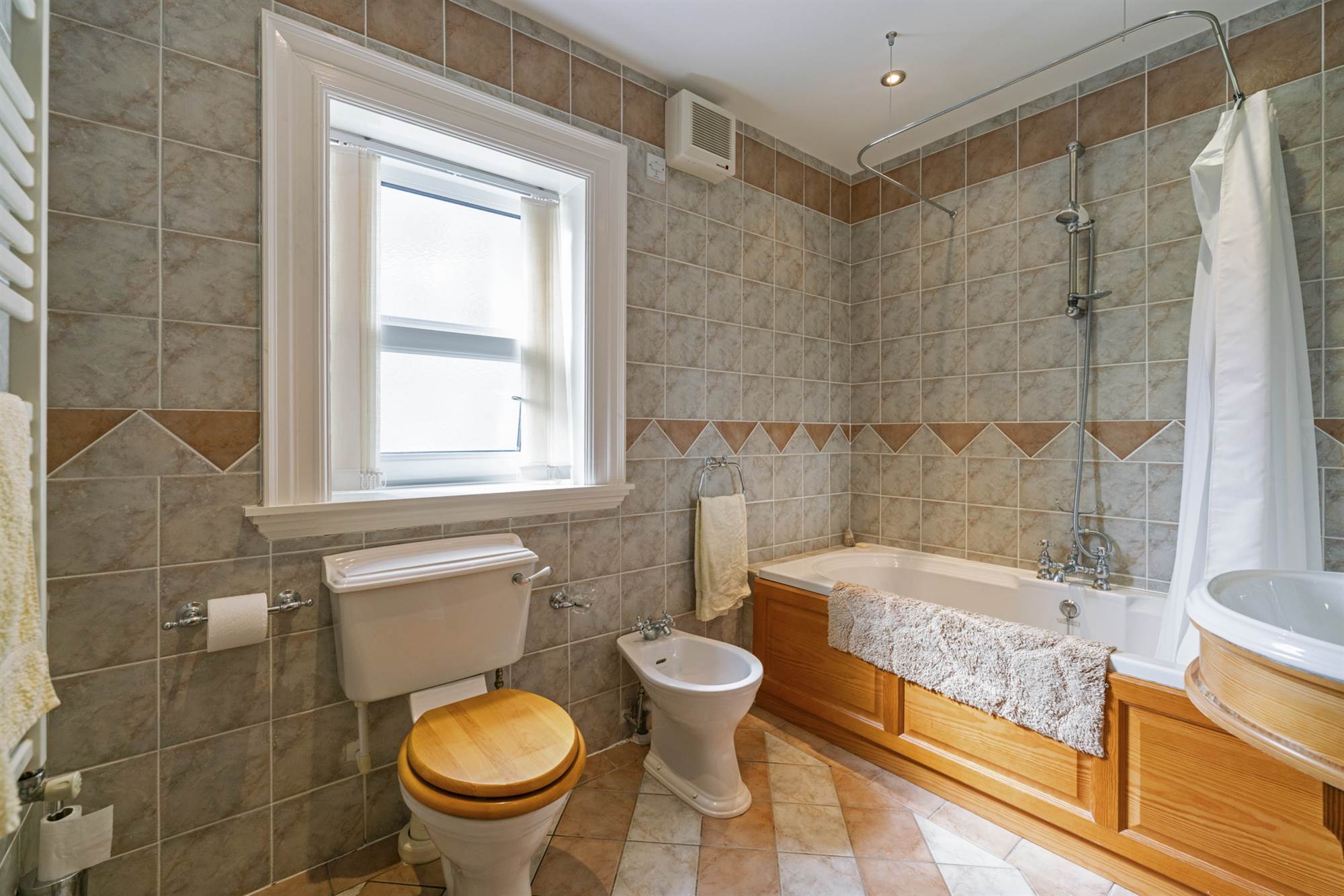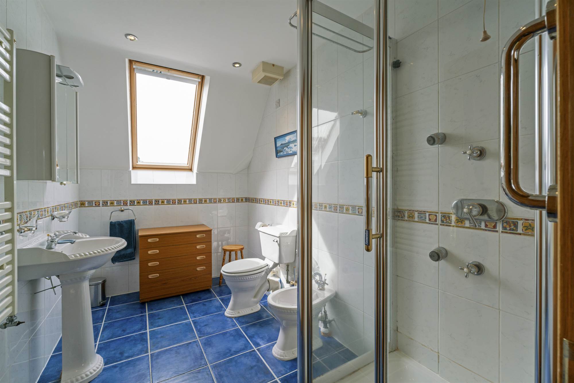 Low flush WC, bidet with mixer taps, pedestal wash hand basin with mixer taps, heated towel rail, enclosed tiled shower cubicle, tiled floor and walls, extractor fan.