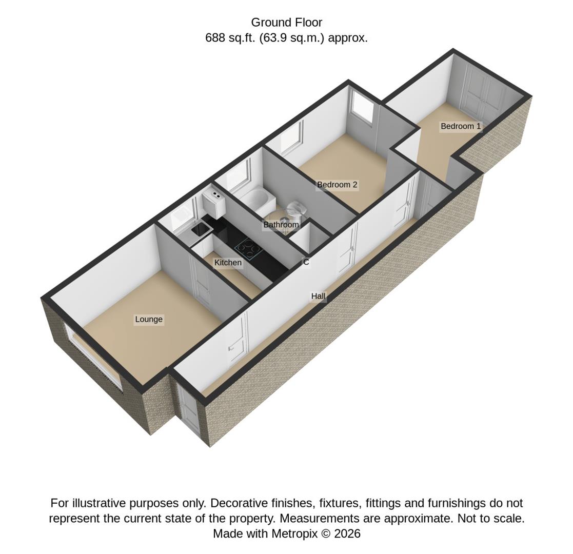Internally, the apartment provides bright and comfortable accommodation throughout. A welcoming reception hall leads to a well-proportioned lounge, offering an ideal space to relax or entertain. The fitted kitchen includes a range of units along with space for appliances, creating a functional and efficient layout for everyday living. Both bedrooms are well-sized, while the bathroom is fitted with a contemporary suite.