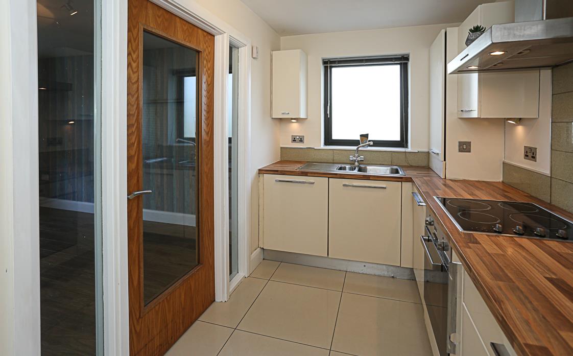 Kitchen with range of high and low level units, integrated dishwasher, integrated washing machine, integrated oven, integrated fridge, integrated freezer, four ring hob, stainless steel extractor, laminate wood effect work surface, stainless steel sink and a half with drainer, chrome mixer taps, outlook to side, concealed gas fired boiler, tiled splashback and sills, tiled floor.
