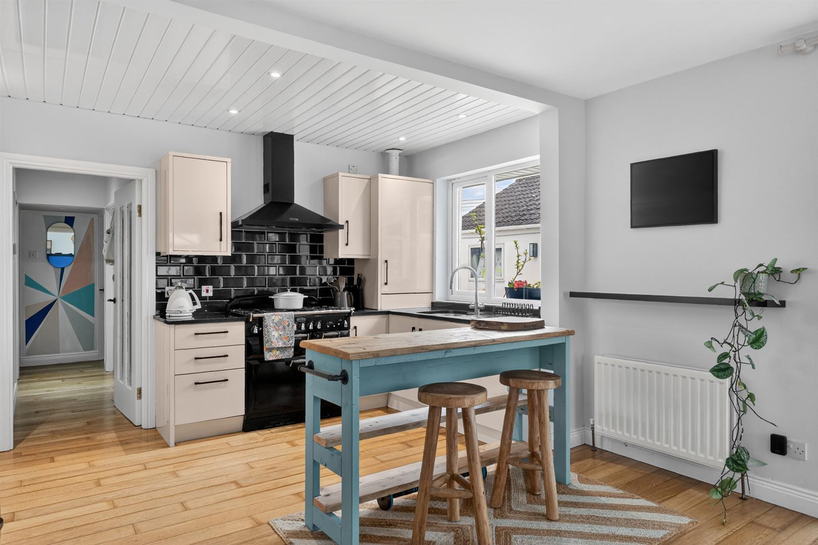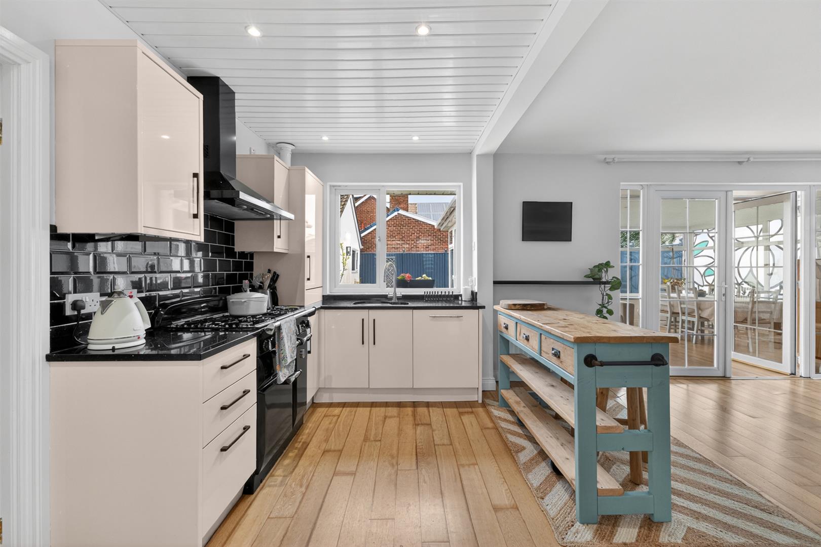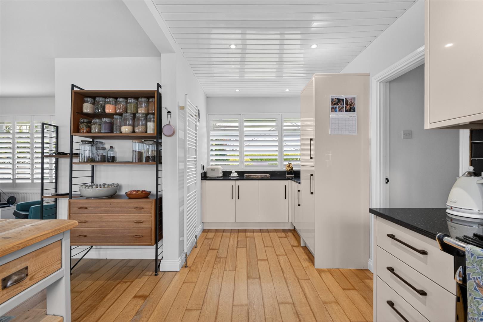 With outlook to front and side, feature hardwood floor, open to kitchen. Modern kitchen with range of high and low level units, space for range, Range Master extractor above, subway style black feature tiling, granite work surface, stainless steel sink and a half with etched in drainer, mixer tap , outlook to rear, integrated dishwasher, fridge and freezer, concealed gas fired boiler.