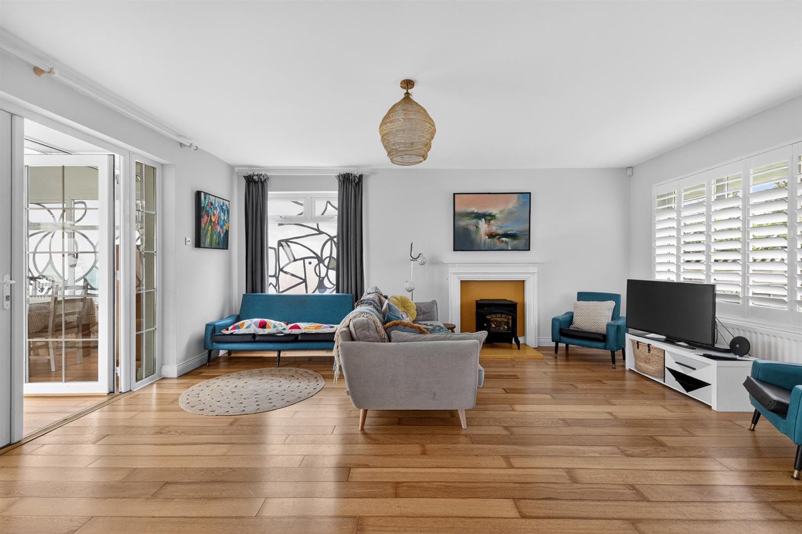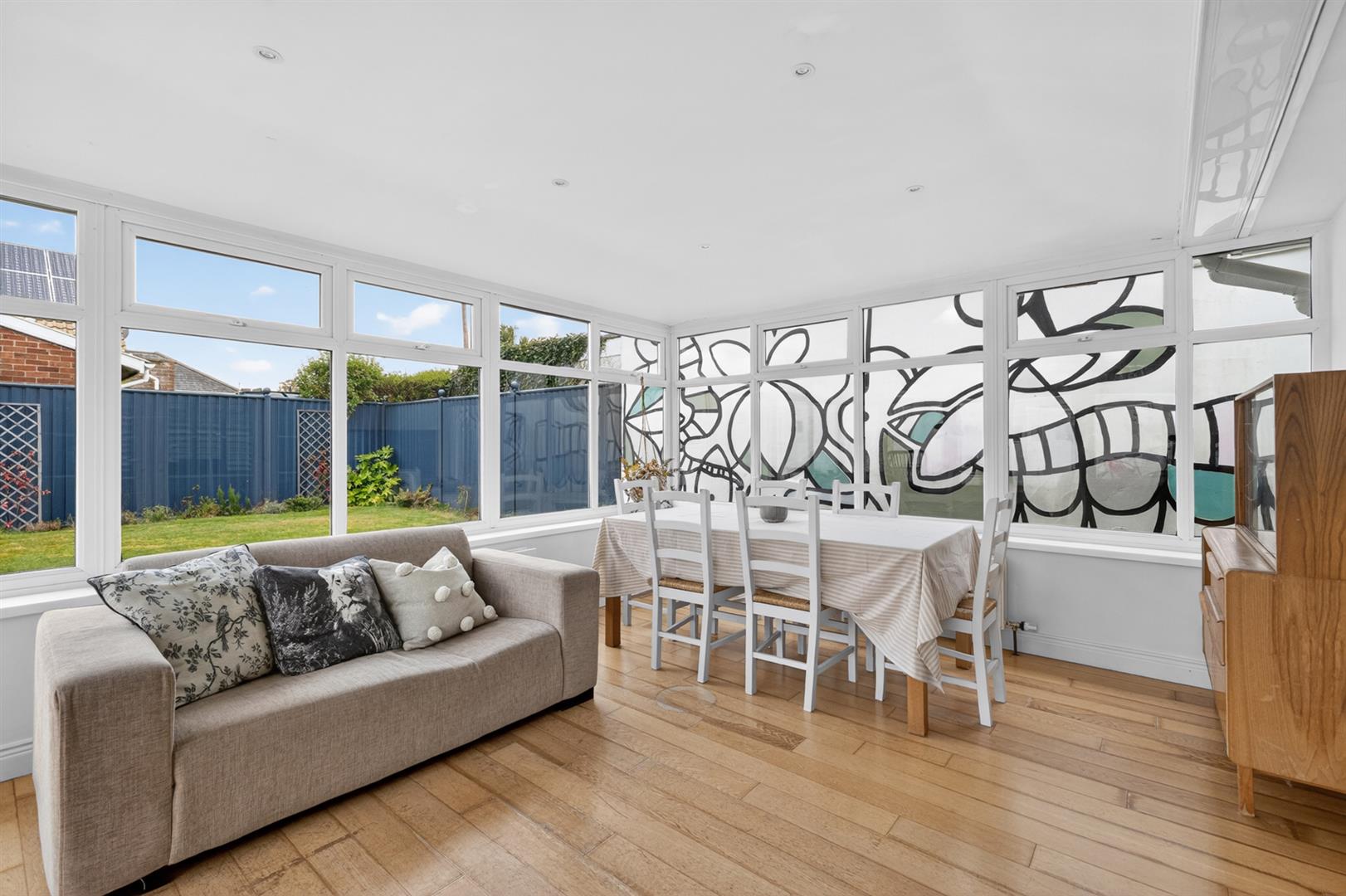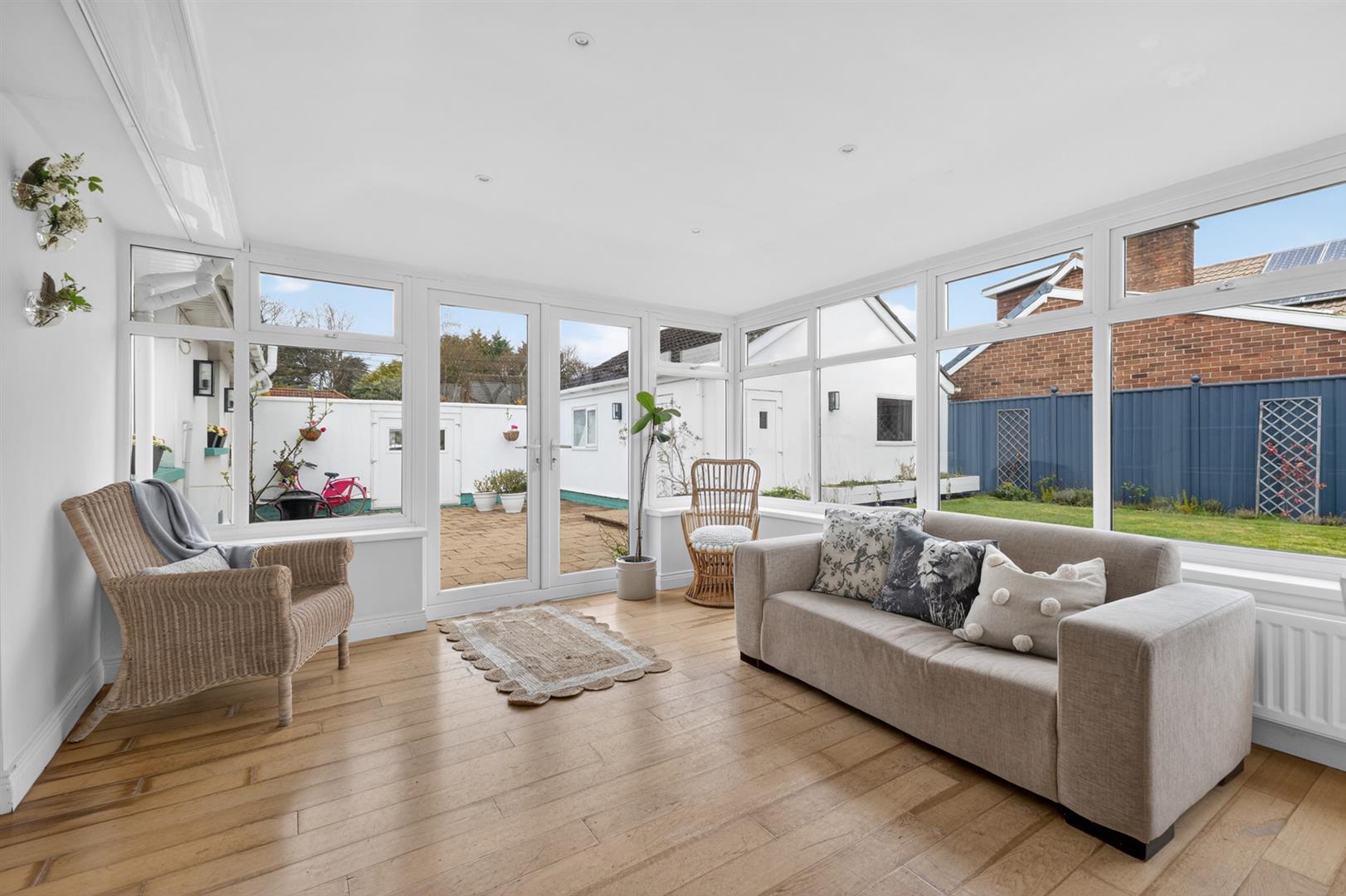 Stunning garden room with hardwood flooring and tri-aspect garden views