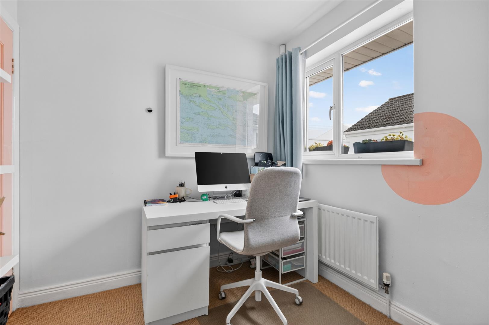 Outlook to rear courtyard, feature built-in shelving.