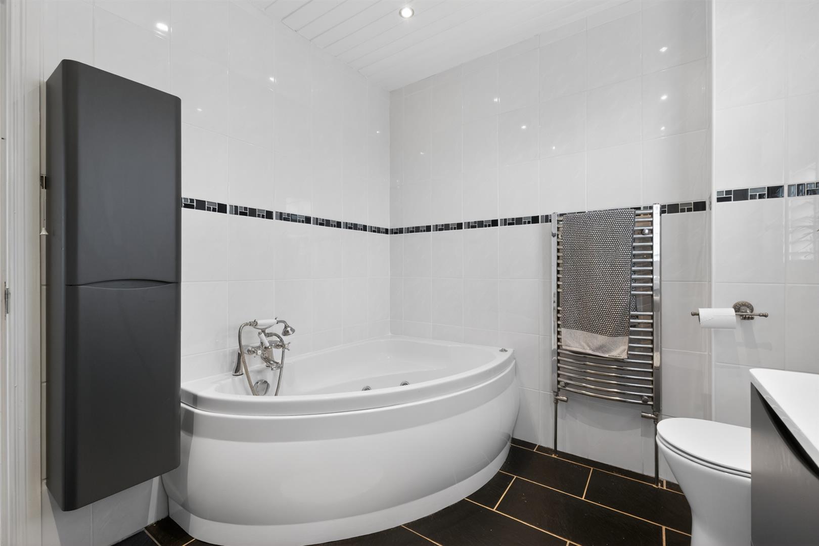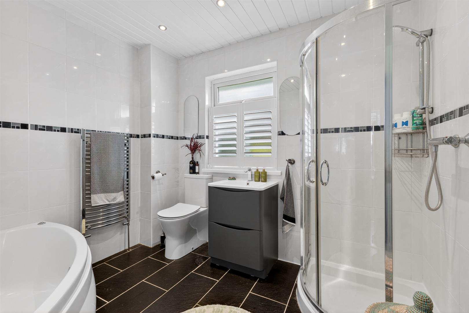 White suite comprising of low flush WC, wall hung wash hand basin, chrome mixer tap, vanity storage below, panelled bath with mixer taps, telephone handle attachment, Jacuzzi bath fittings, walk-in thermostatically controlled shower, telephone handle attachment, sliding glazed shower screen, tiled walls, tiled floor, chrome heated towel rail, uPVC tongue and groove ceiling, inset spotlights, extractor fan.