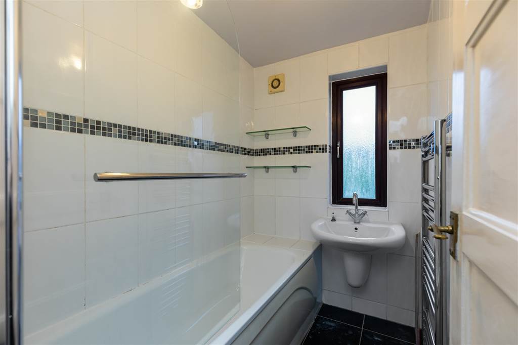 White suite comprising panel bath with electric shower and screen door, pedestal wash hand basin, tiled walls and floor, heated towel rail. Seperate wc.