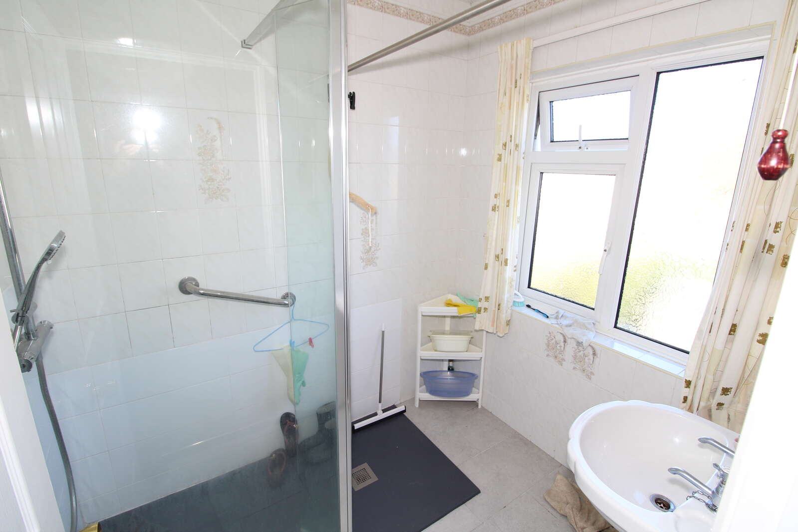 Fully tiled shower room with walk in shower cubicle & thermostatically controlled shower and pedestal wash hand basin.
