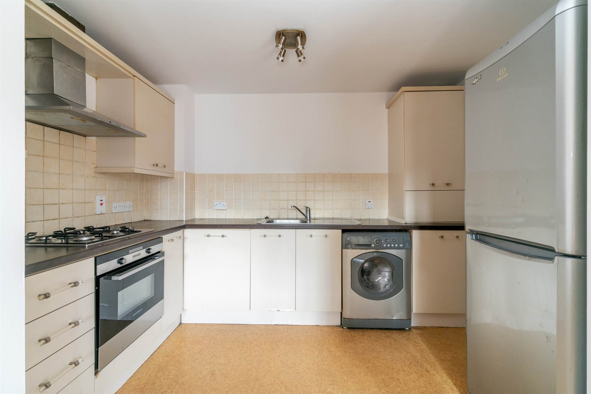Range of high and low level units, inset sink, hob, electric oven, freestanding washer/dryer, fridge freezer