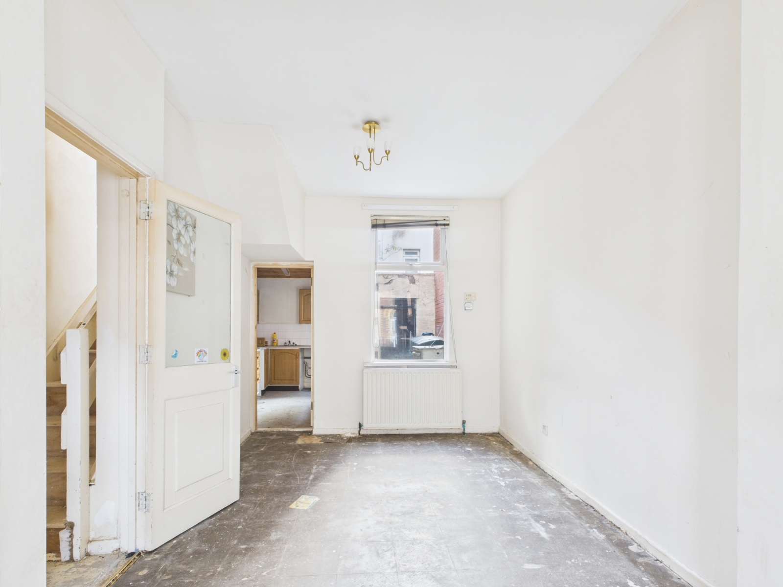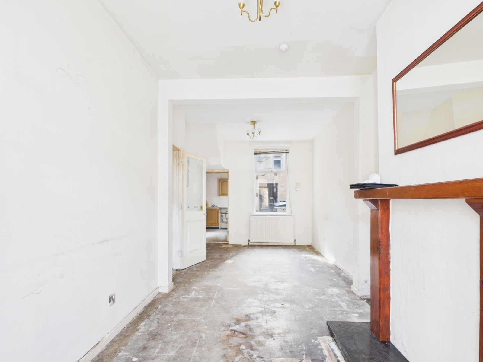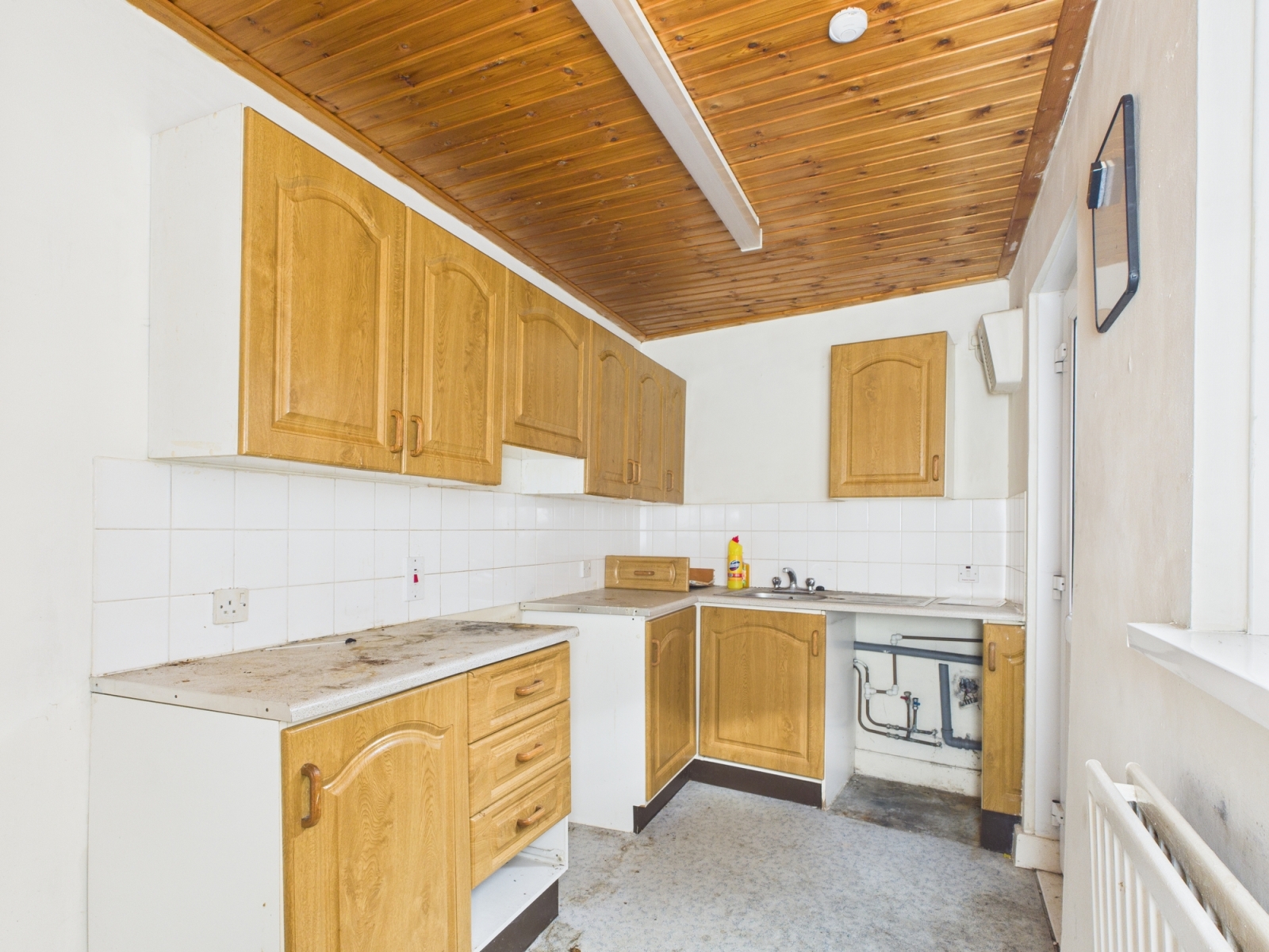 The accommodation comprises an open plan living and dining area to the front, with a separate kitchen at the rear providing access to the enclosed yard. Upstairs, there are two well-proportioned bedrooms and a bathroom. While the property requires complete refurbishment, it offers a practical layout and plenty of scope to add value.