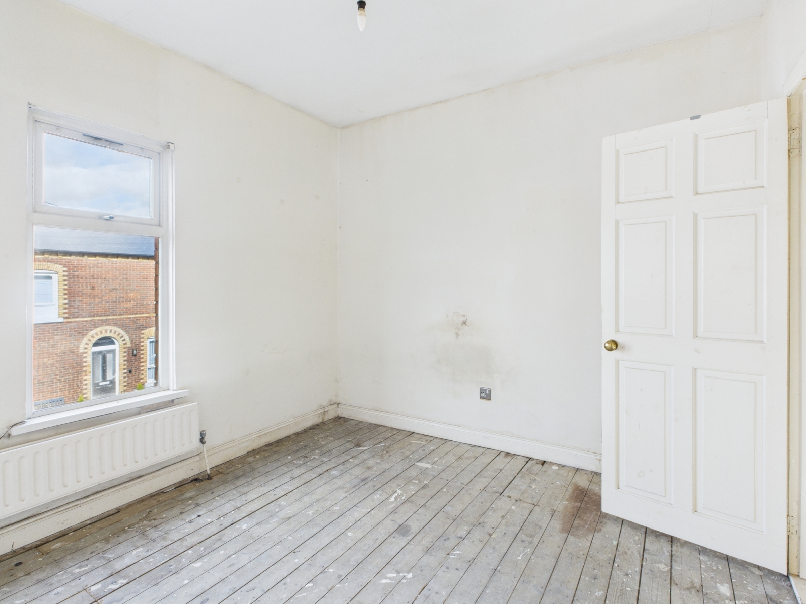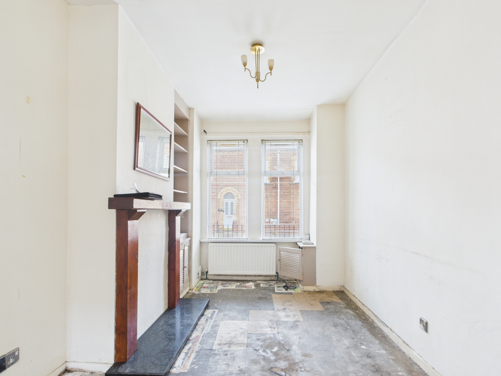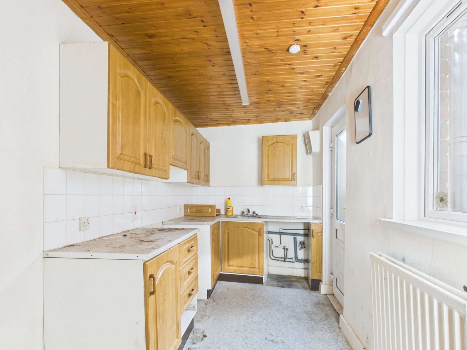 The accommodation comprises an open plan living and dining area to the front, with a separate kitchen at the rear providing access to the enclosed yard. Upstairs, there are two well-proportioned bedrooms and a bathroom. While the property requires complete refurbishment, it offers a practical layout and plenty of scope to add value.