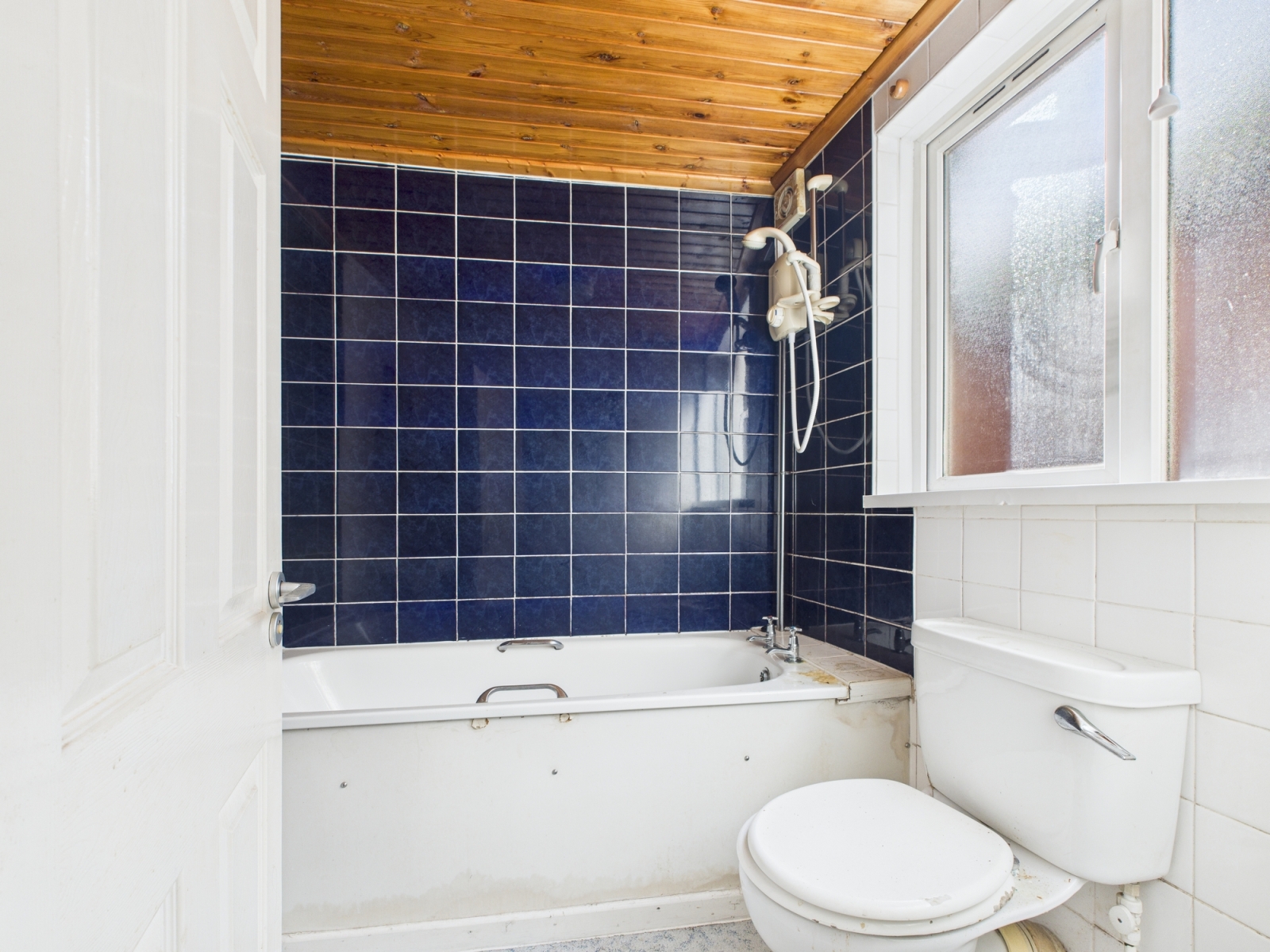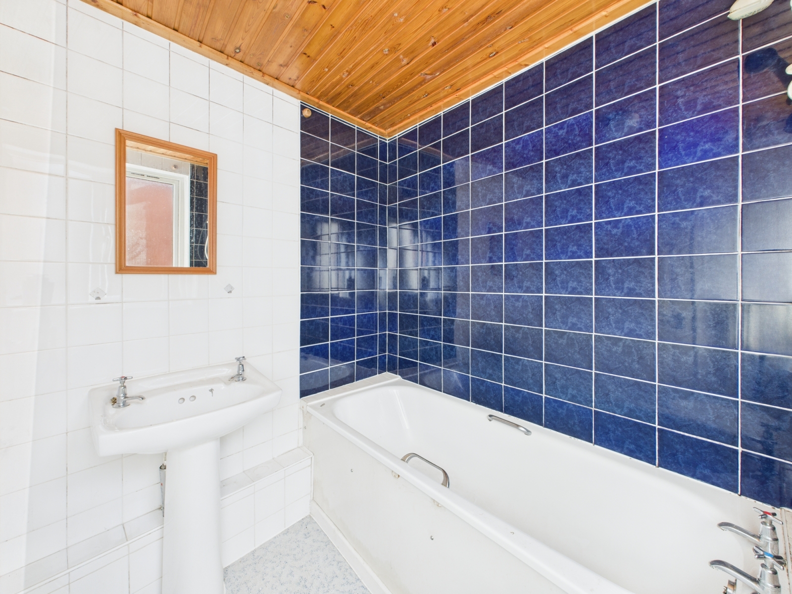 Bath with partly tiled wall, electric showwer, low flush WC, pedestal wash hand basin