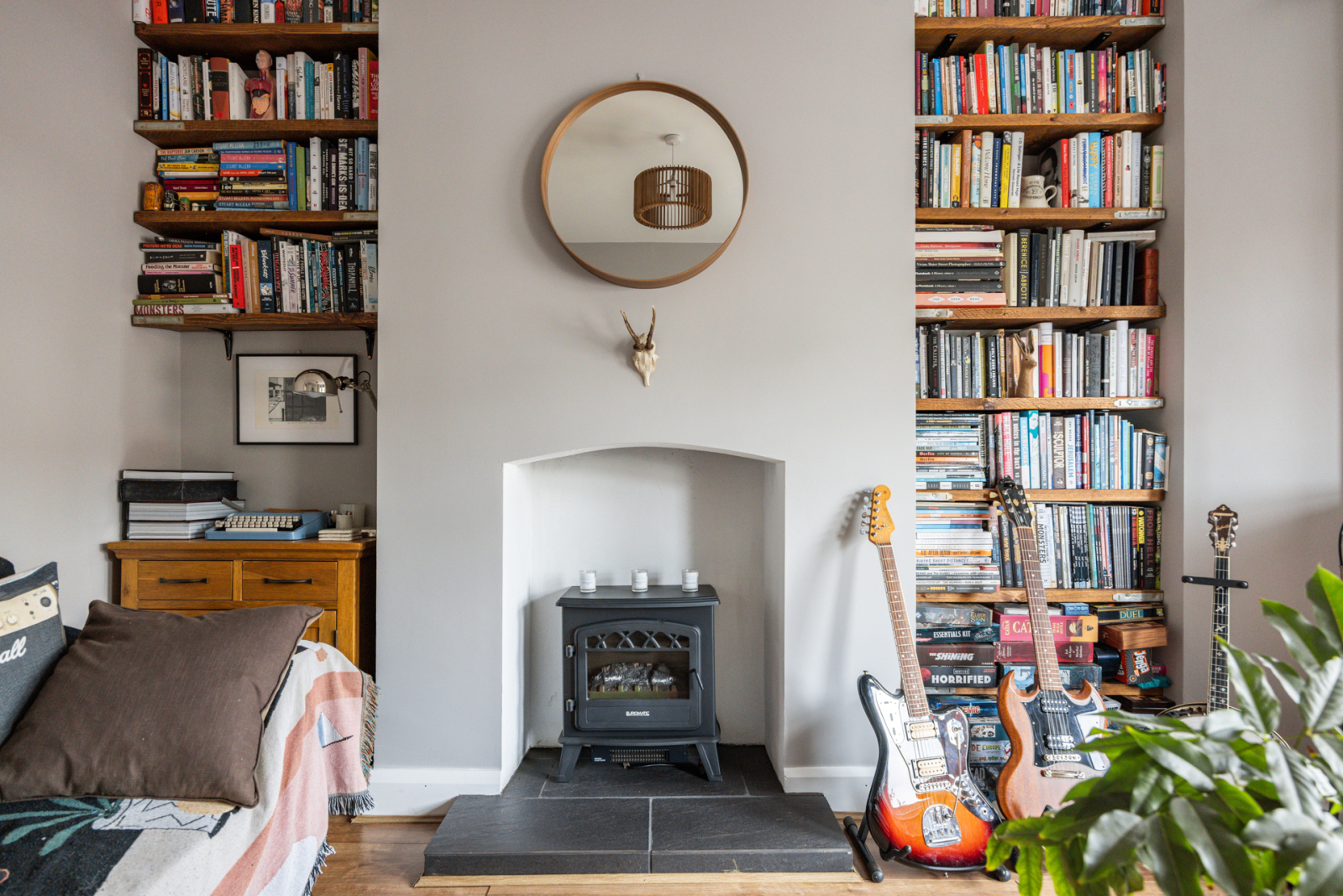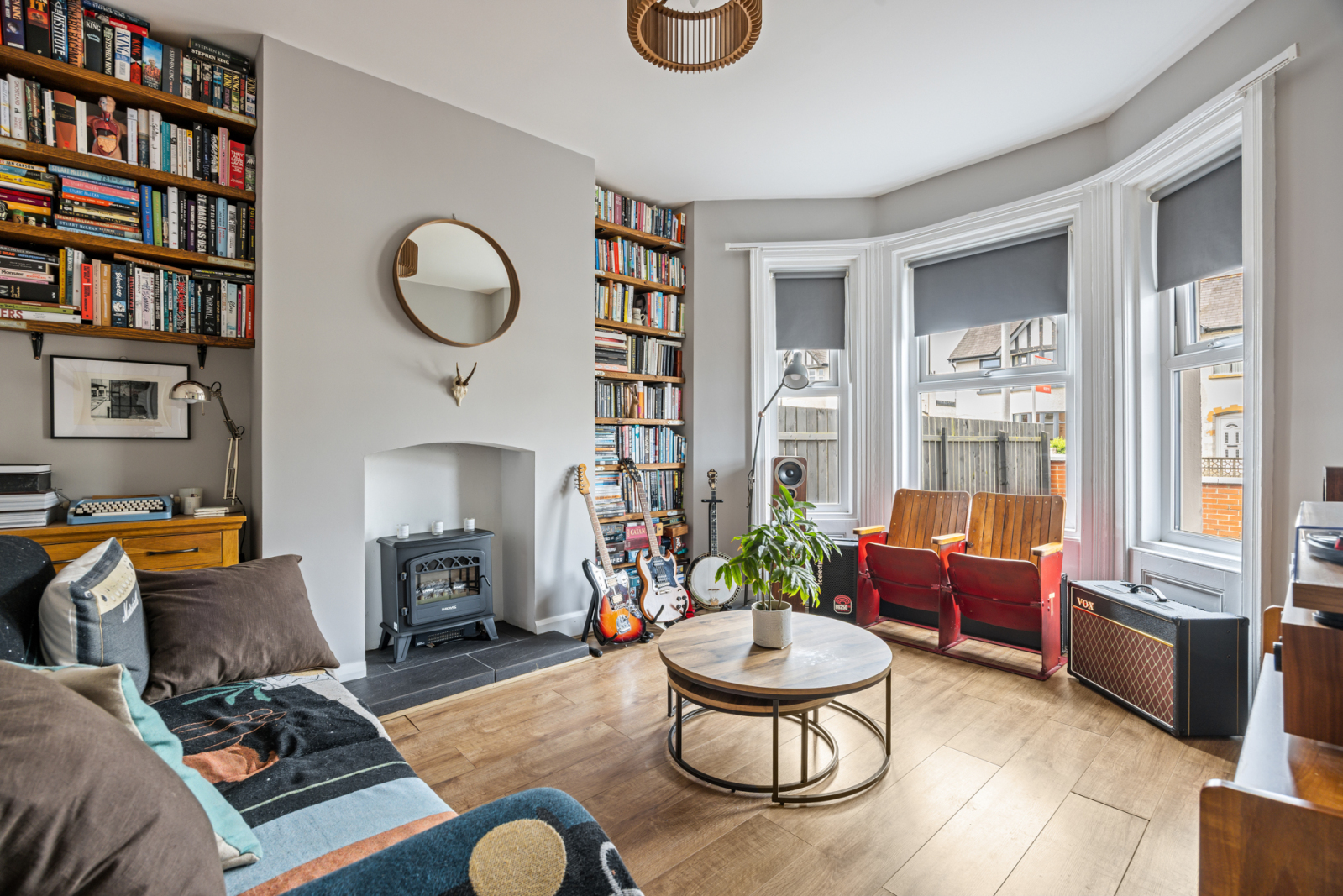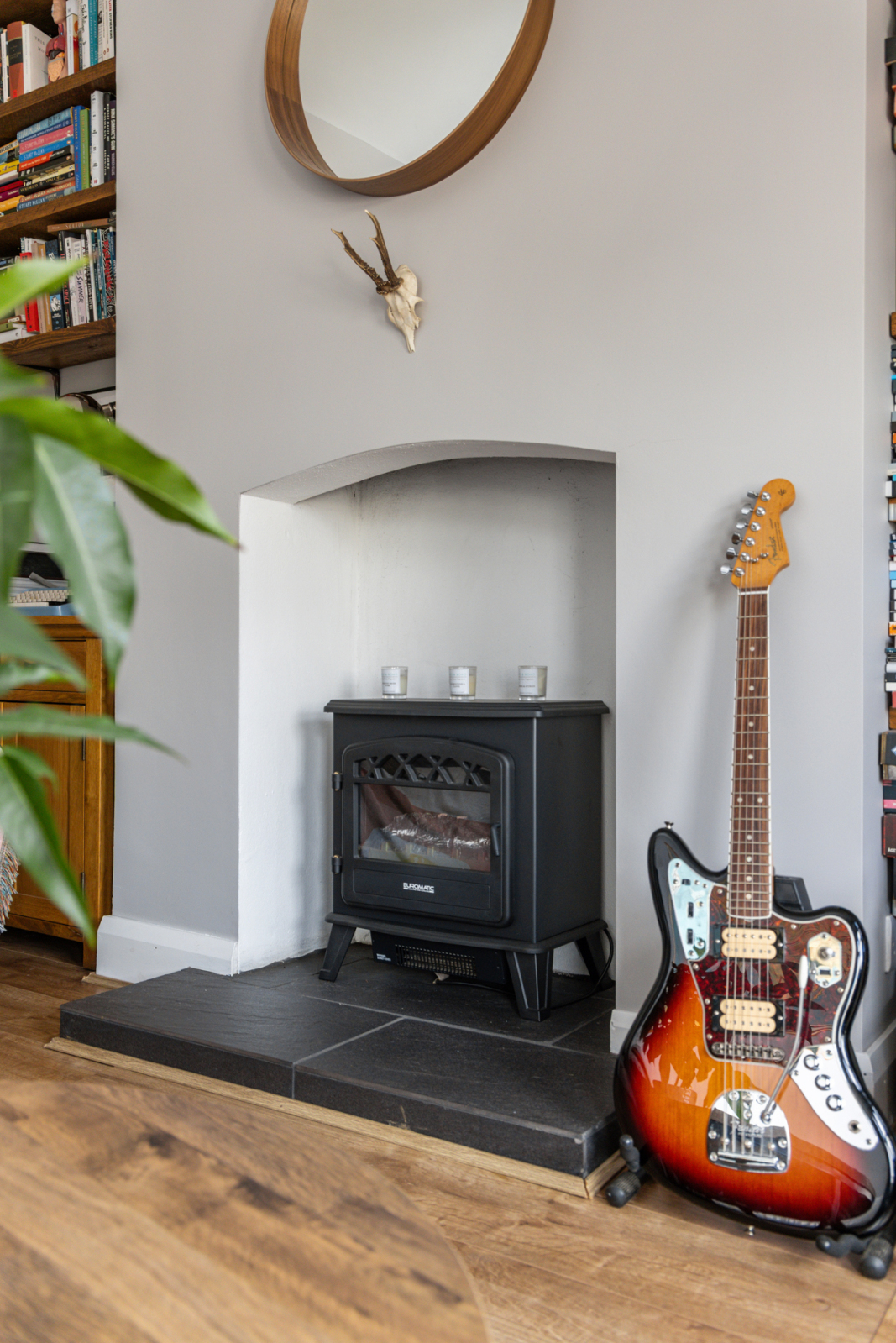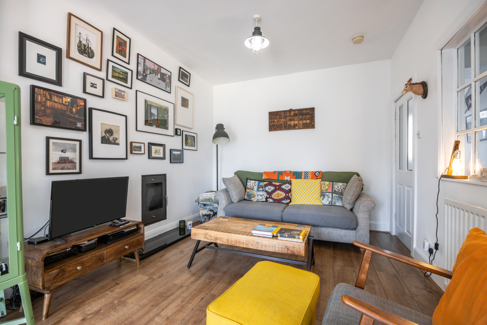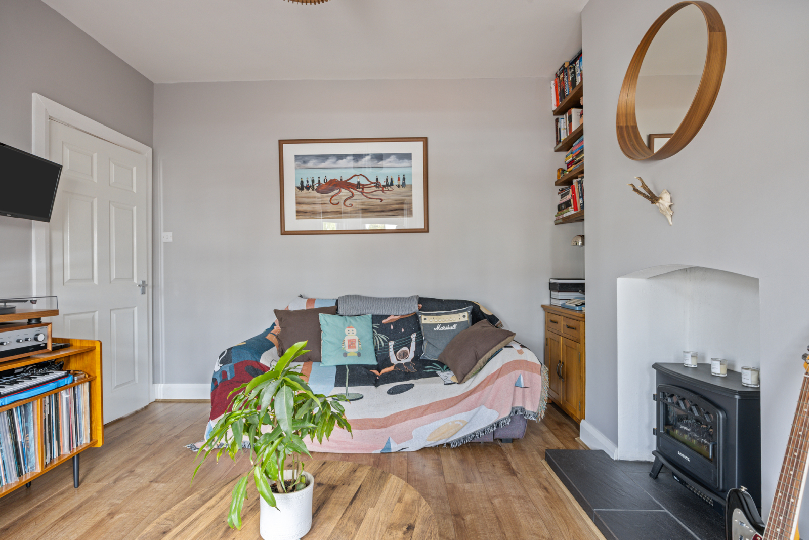 Glass fronted wood burning stove, wood laminate flooring, French double doors to rear.