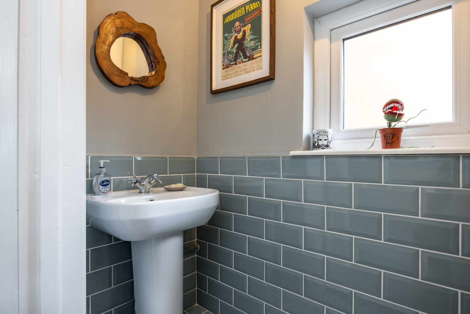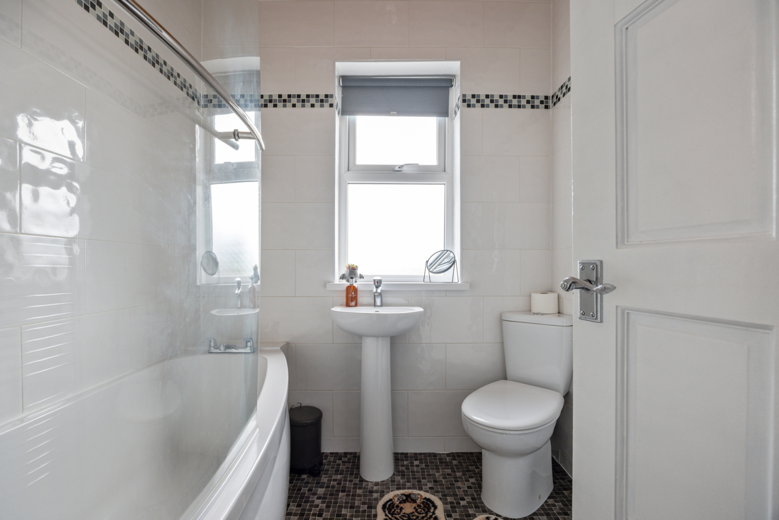 Low flush WC, pedestal wash hand basin with mixer taps, ceramic tiled floor, gas boiler.