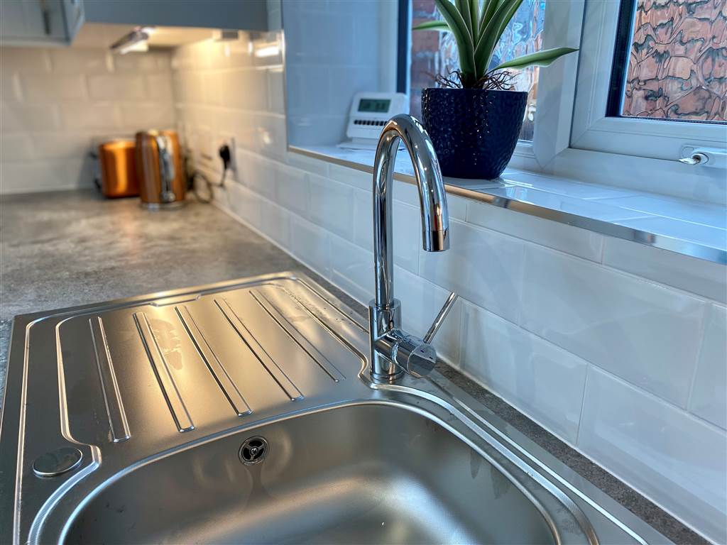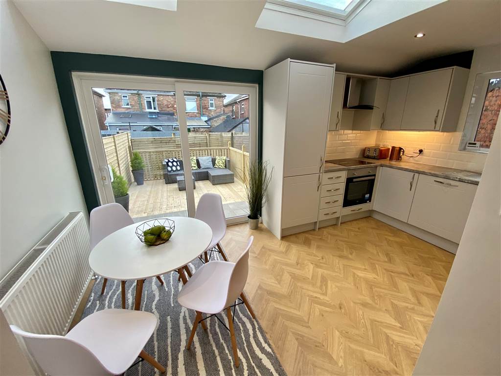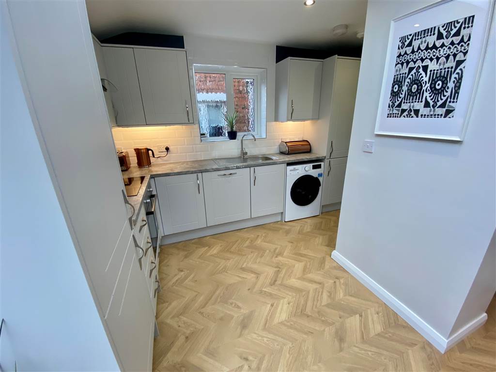 Range of high and low level units with marble effect worktops. . Built in electric hob, oven and extractor hood. Built in fridge freezer. Built in dishwasher. Plumbed for washing machine. Under unit lighting. Stainless steel sink with drainer. Spot lighting. Patio doors leading to rear garden.