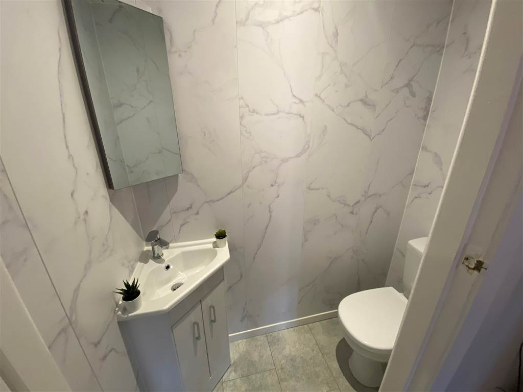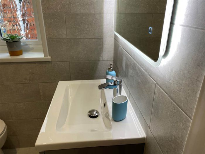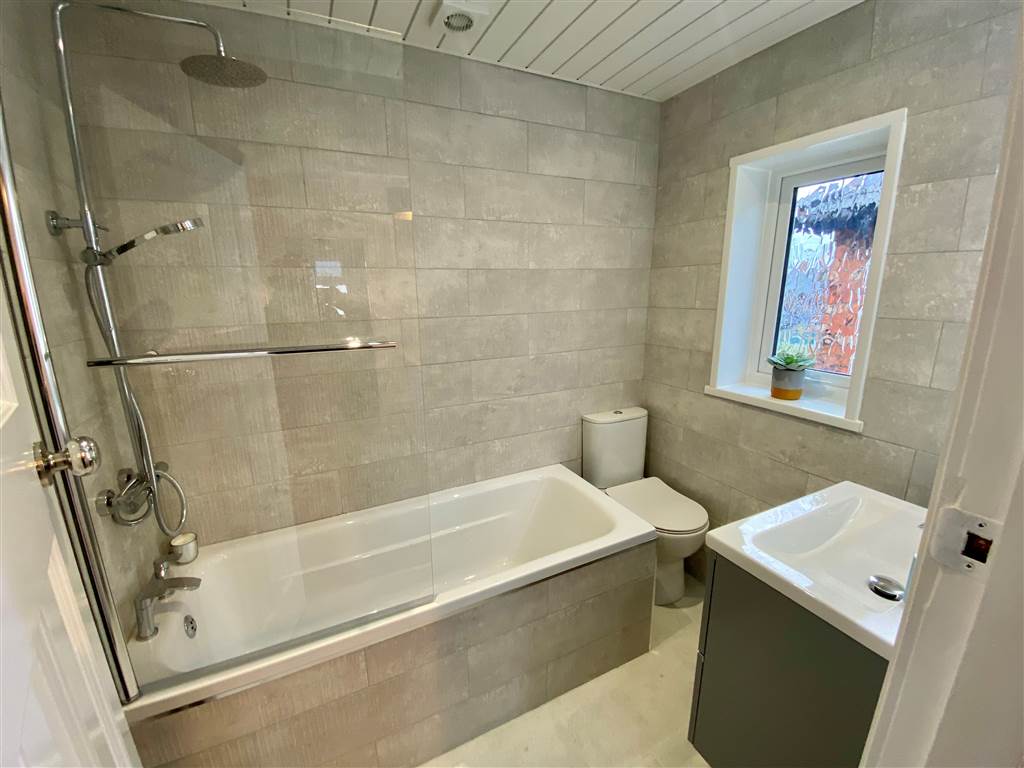Panel bath with overhead showe with drencher system, dual flush w.c, wash hand basin with vanity unit. Feature bathroom mirror. Tiled floor and walls.