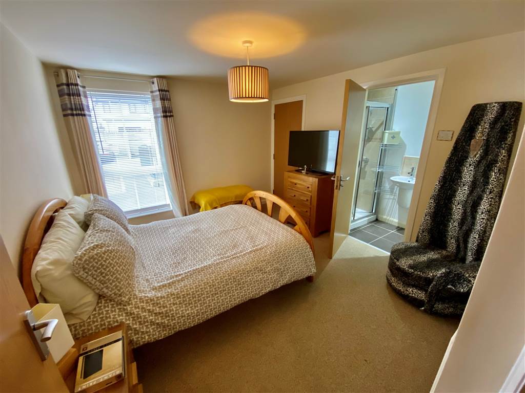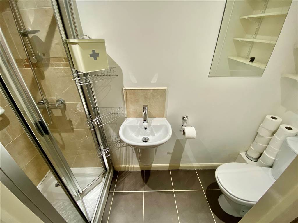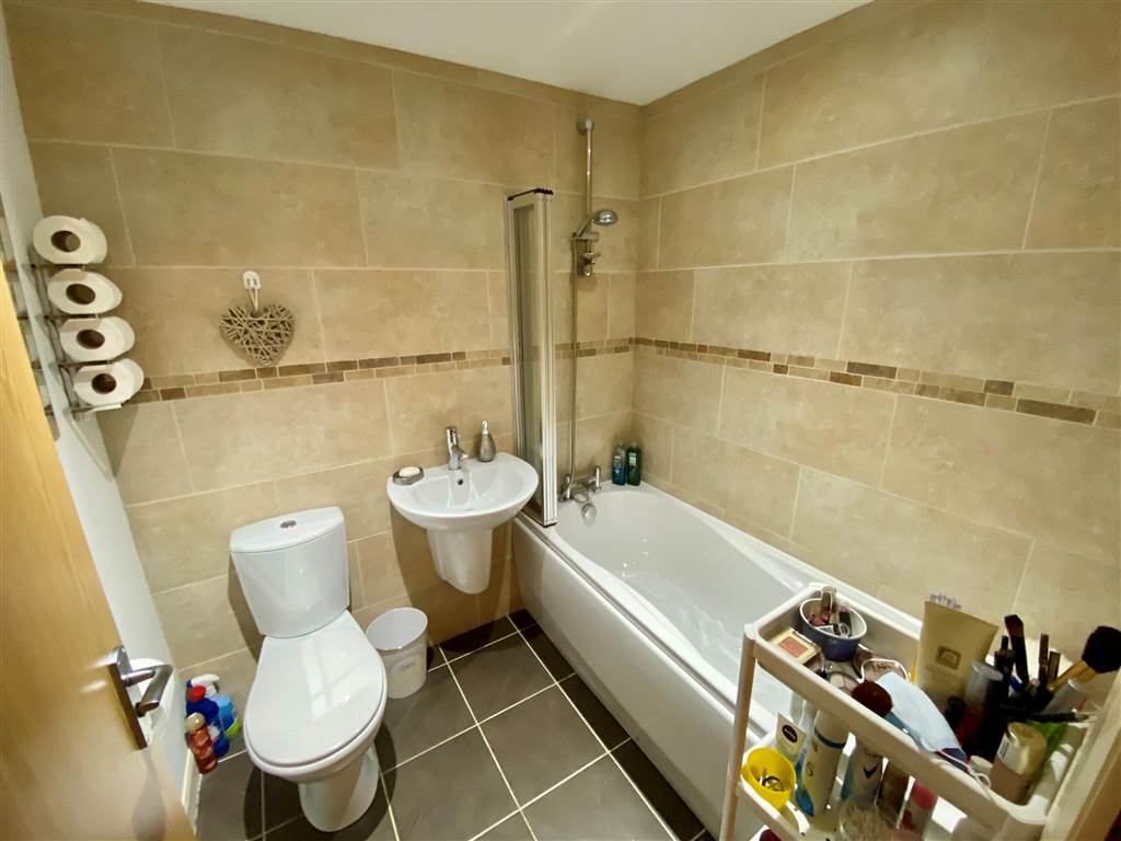 White suite: Panel bath with built in shower, dual flush w.c, wash hand basin. Tiled floor. Tiled walls.