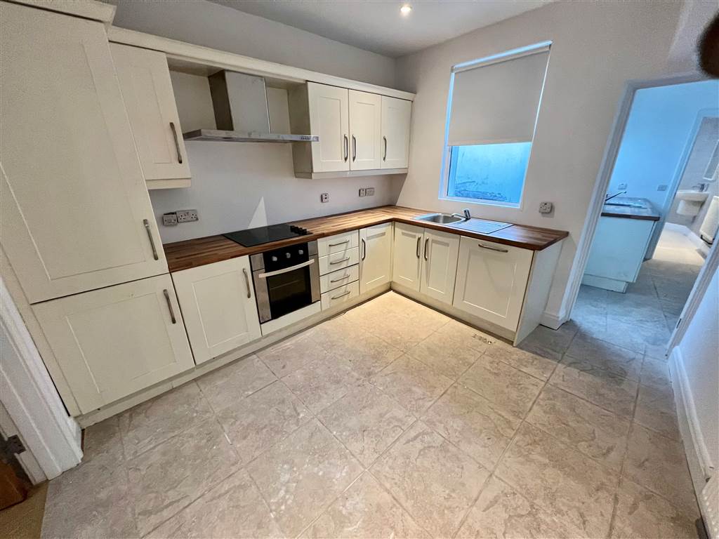 Range of high and low level units with wood effect worktops. Stainless steel sink with drainer. Built in hob, oven and extractor hood. Built in fridge freezer and integrated dishwasher.