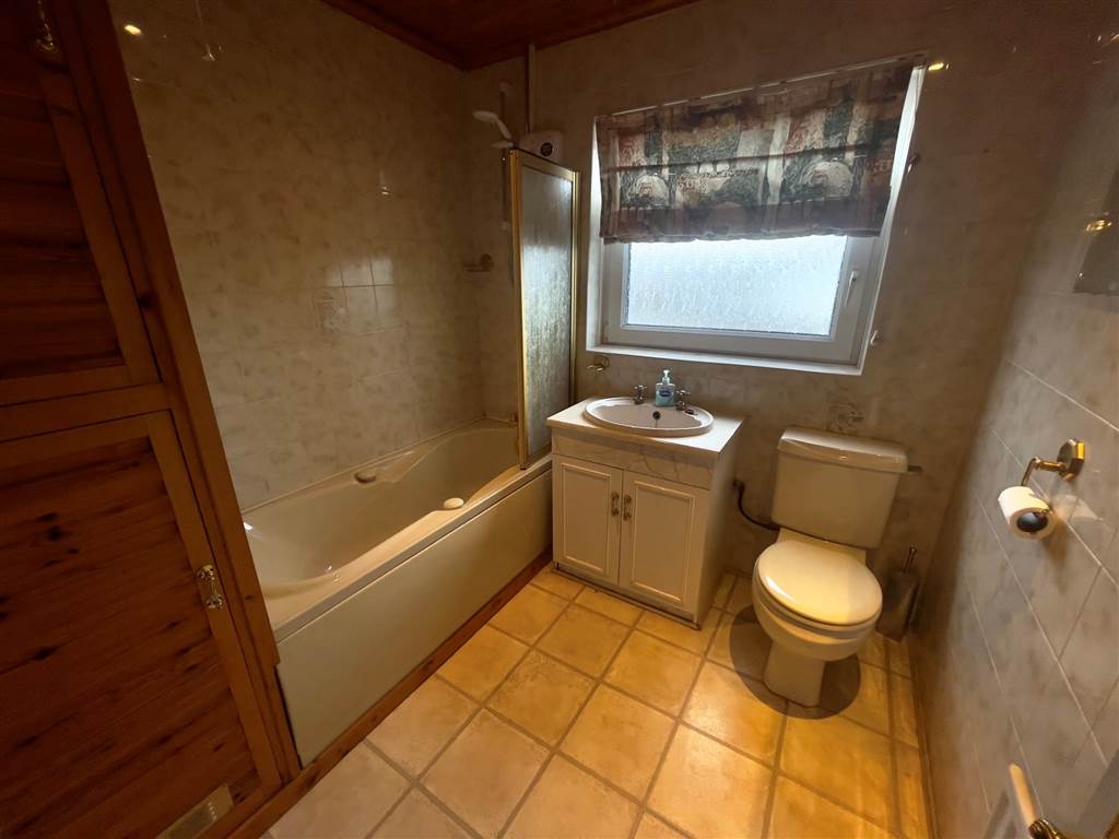 Bath with electric shower over, lfwc and sink unit, fully tiled walls. Hotpress.