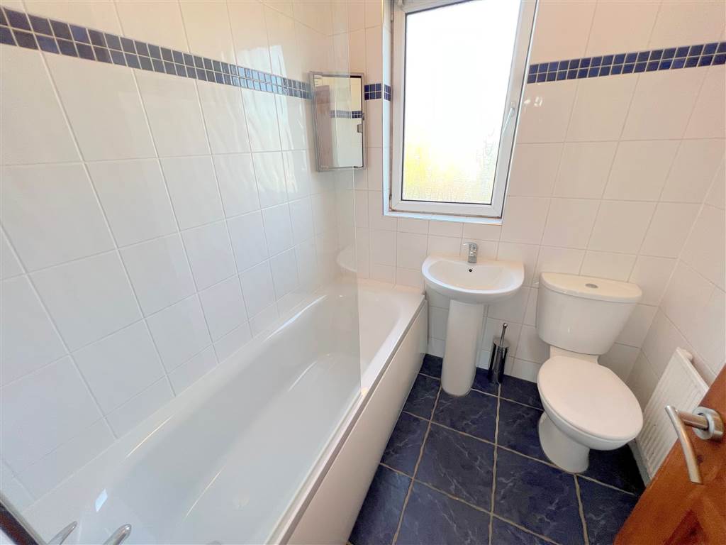 Panelled bath with mixer tap, pedestal wash hand basin, low flush wc,