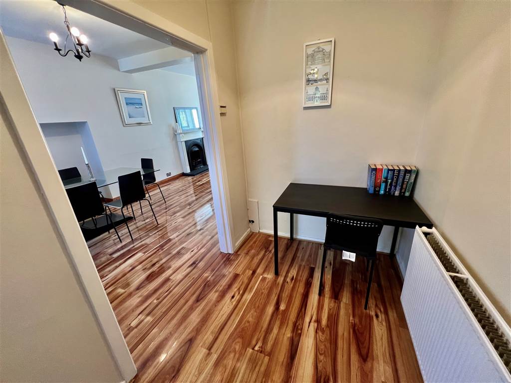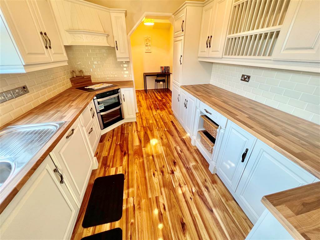 Excellent range of modern high and low level units, single drainer stainless steel sink unit with mixer tap, new built-in halogen hob and double oven, extractor fan over, built-in Neff dishwasher, plumbed for washing machine, fridge freezer housing, feature high gloss finish wooden floor, superb part tiled walls.
