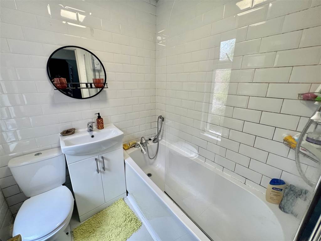 White suite : Panel bath with overhead electric shower, wash hand basin with vanity unit, dual flush w.c. Tiled floor. Tiled walls.
