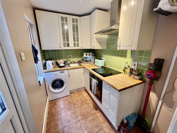 Range of high and low level units with solid wood worktops. Built in oven , hob and extractor hood. Stainless steel sink with drainer. Plumbed for washing machine. Tiled floor. Part tiled walls. Access to rear