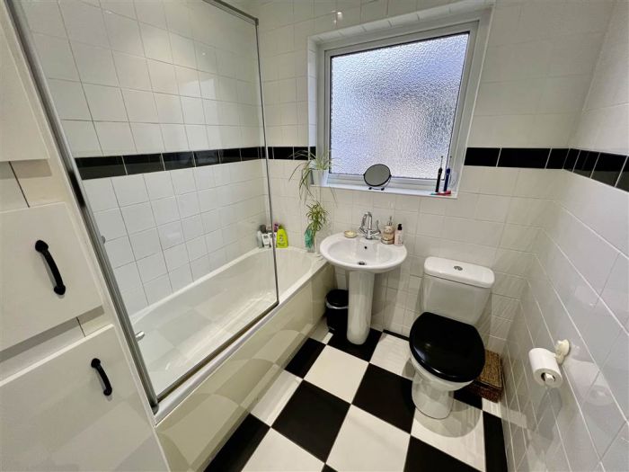 White suite comprising low flush WC with push button, pedestal wash hand basin with chrome mixer tap, panelled bath with fixed glass door, bath with chrome mixer taps, shower with chrome thermostatic control valve, up and over telephone hand unit, fully tiled walls, chequered tiled floor, frosted glass window, uPVC tongue and groove ceiling, low voltage recessed spotlighting, built-in hotpress with additional built-in storage and access to Worcester Bosch gas boiler.