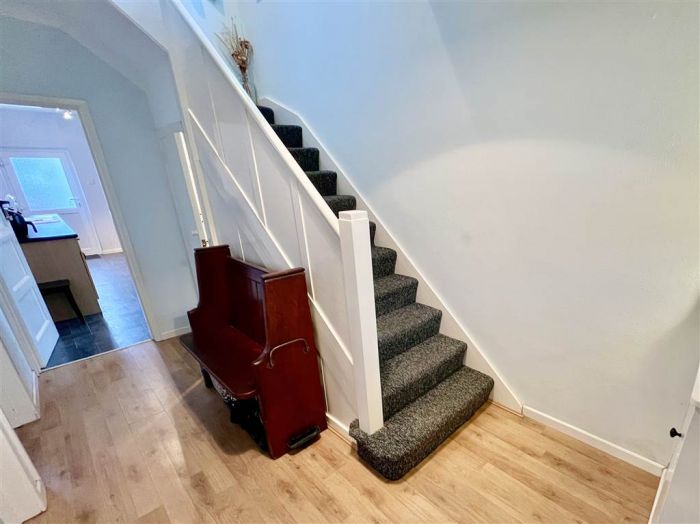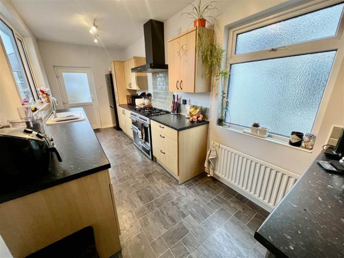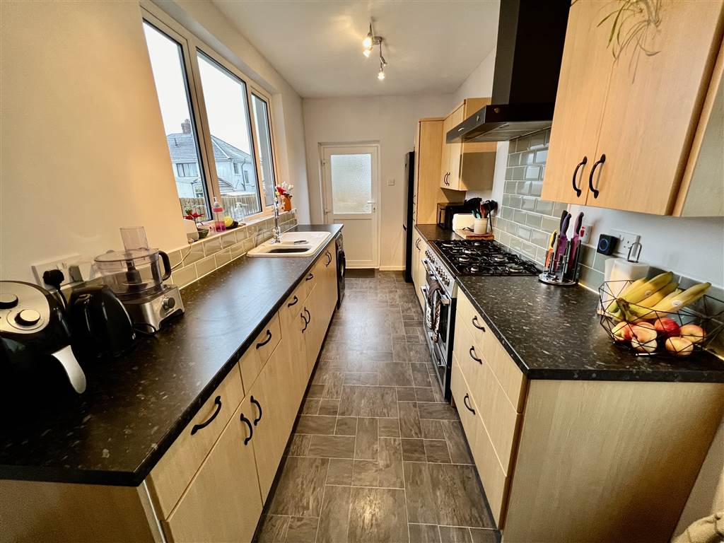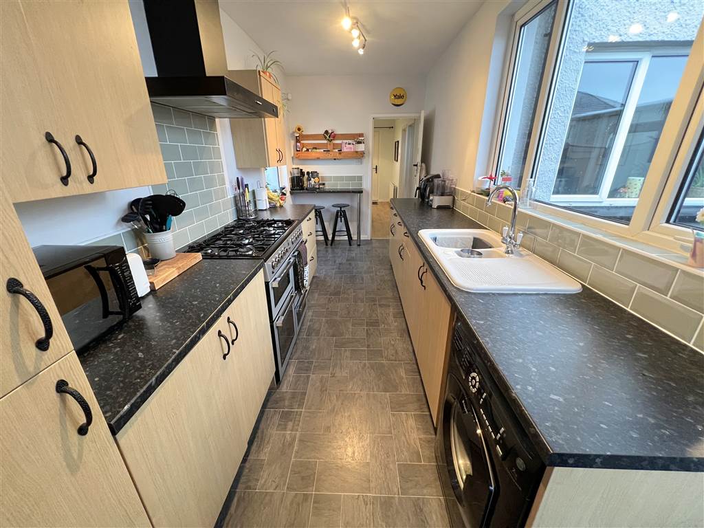 Bespoke fitted kitchen with range of high and low level units, laminate effect worktops, ceramic sink with chrome mixer tap, space for washing machine, space for fridge freezer, space for range style cooker, built-in matt black extractor fan, metro style tiled splashback, picture window, built-in breakfast bar with metro style tiled splashback, laminate flooring, uPVC double glazed access door leading to rear garden.