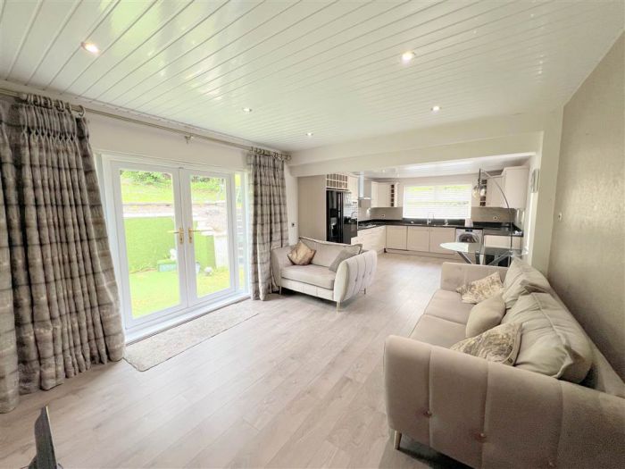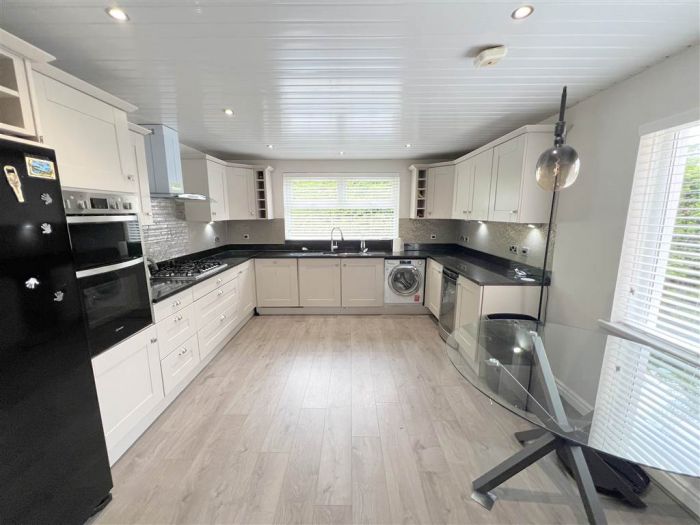 Range of high and low level units plumbed for washing machine, integrated dishwasher, built in 5 ring hob, space for American fridge freezer and double patio doors leading to rear garden.