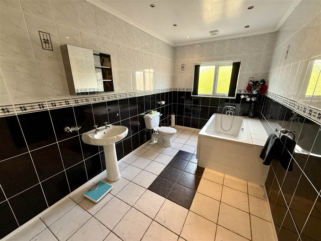 Comprising panelled bath with mixer taps, pedestal wash hand basin, low flush w.c Fully tiled walls. Tiled flooring. Spot-lights.