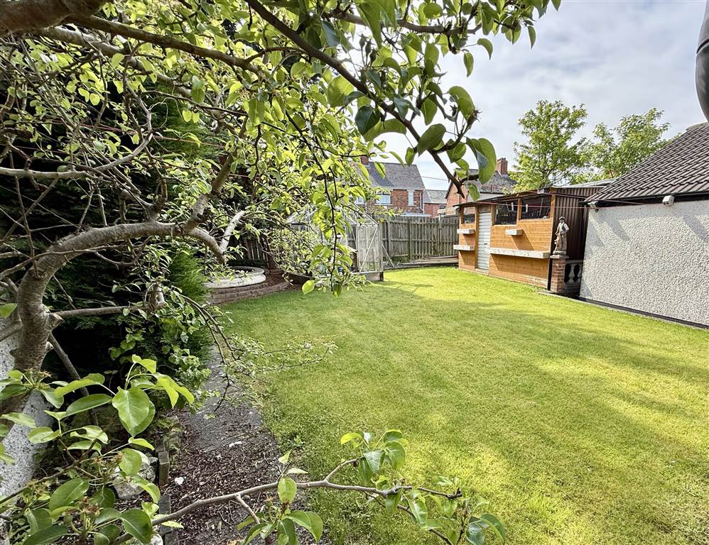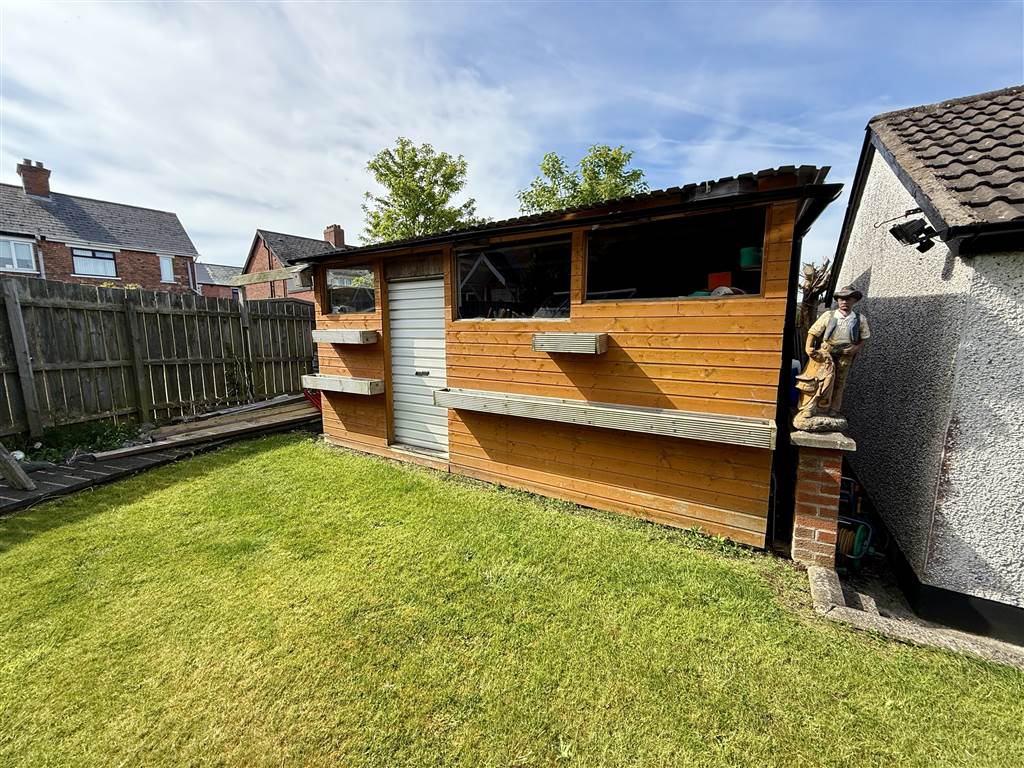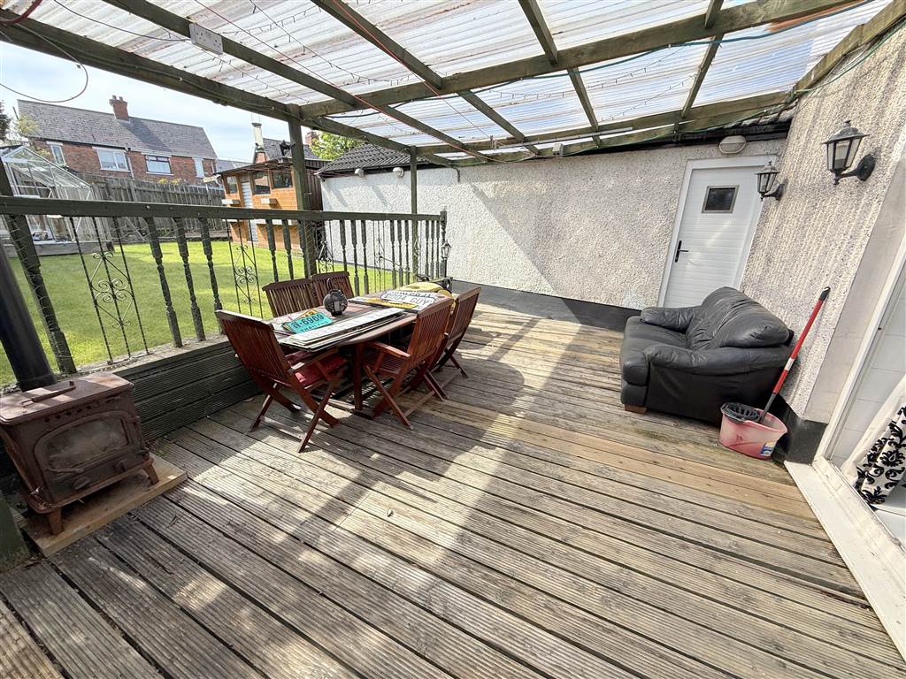 Enclosed decked patio area accessed from the kitchen / dining. Access to garden laid in lawns, additional storage shed to rear of garage.