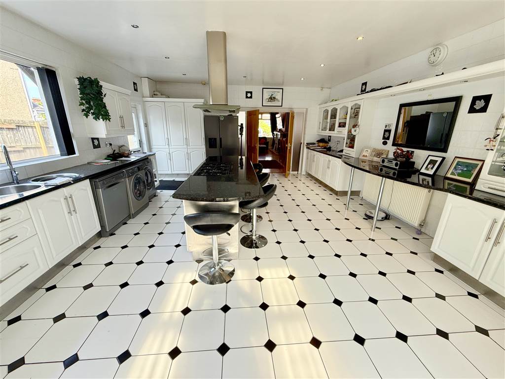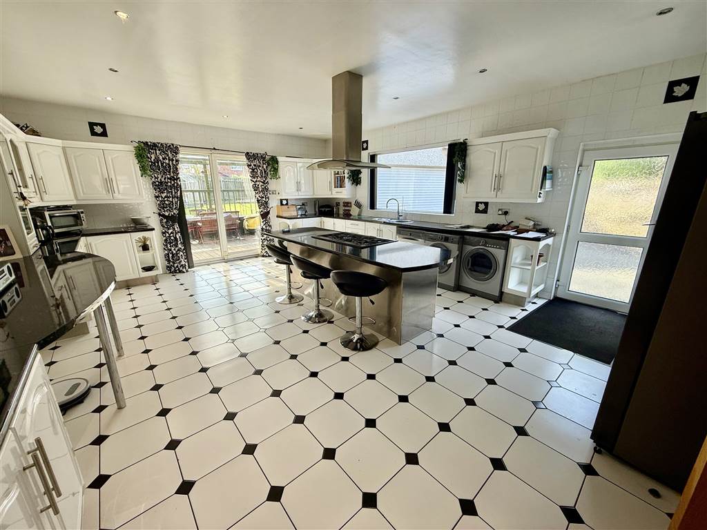 Full range of high and low level units, glazed display cabinets, Centre island with 5 ring gas hob and stainless steel overhead extractor fan, breakfast bar. Fully tiled walls. Tiled flooring. Sliding doors providing access to enclosed decked patio area and garden laid in lawns. Side access also leads to driveway and detached garage.