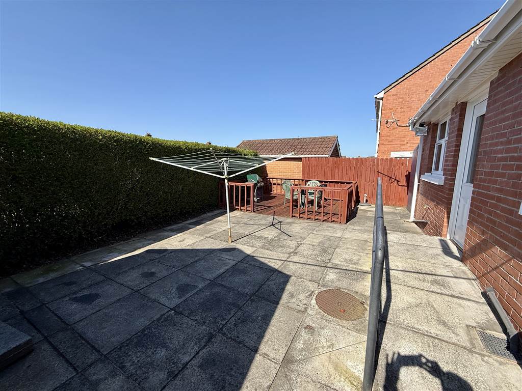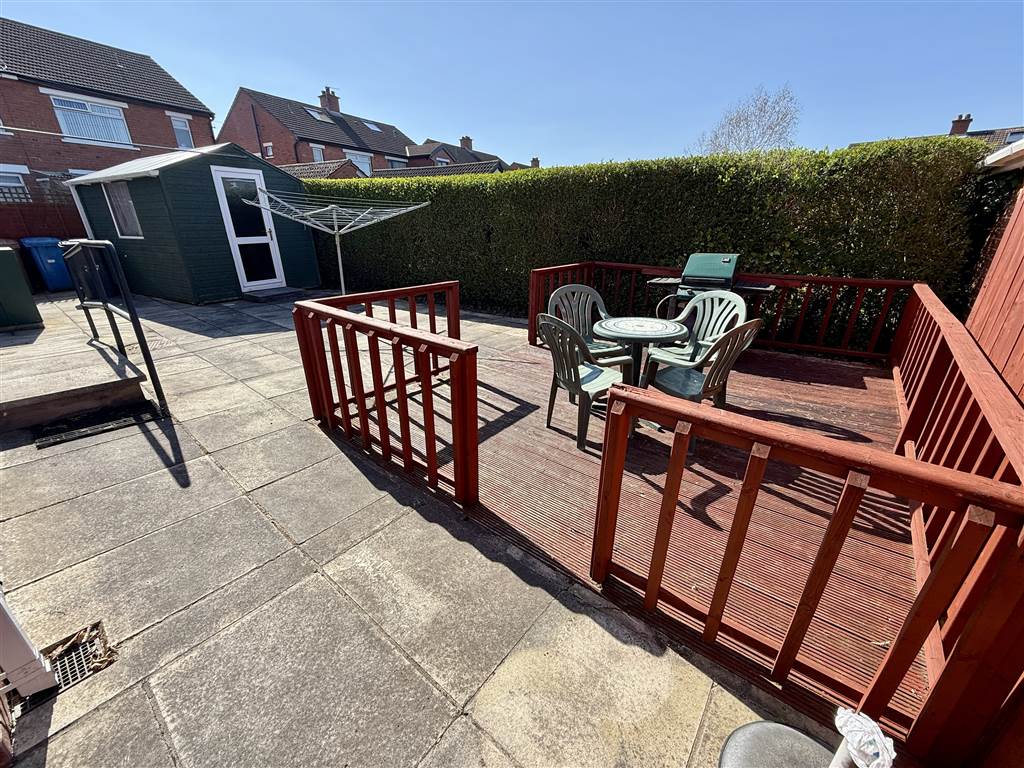 Enclosed rear patio garden in flag stones and decked area, boundary hedging and fencing. Covered area to side. Garden shed with power . Outside light and tap.