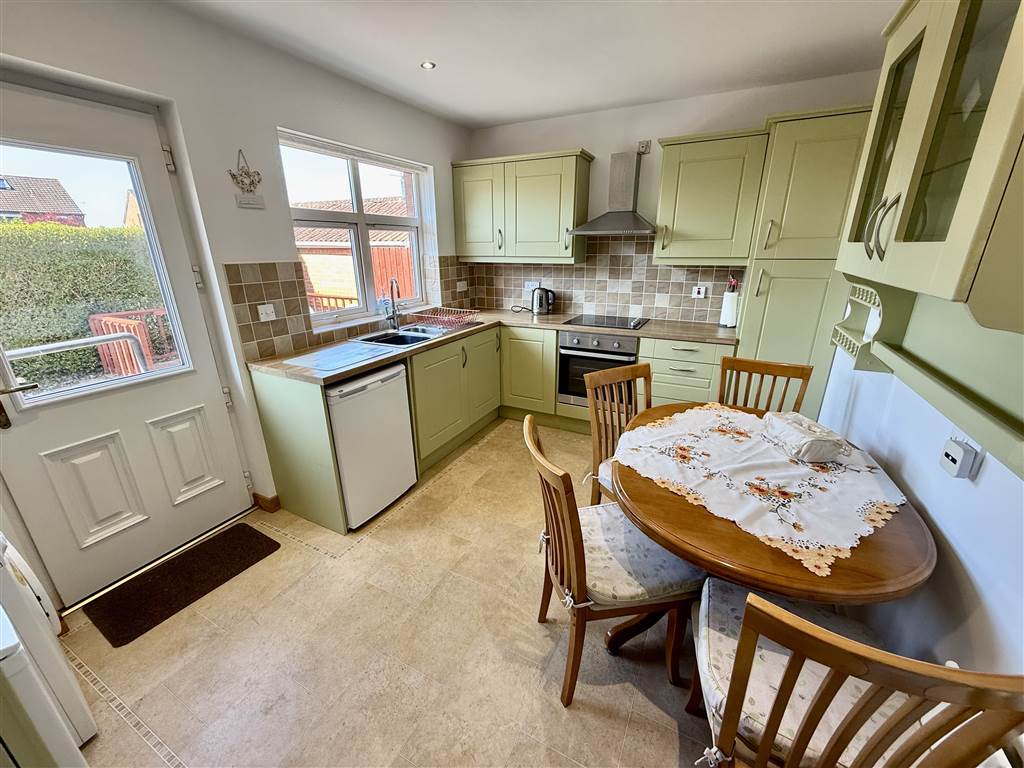 Modern fitted kitchen with range of high and low level units, work surfaces, single drainer stainless steel sink unit with mixer tap, integrated stainless steel oven and four ring hob, extractor canopy, glazed display cabinets, plumbed for washing machine, concealed lighting, ceramic tiled floor, part tiled walls, recessed spotlights, uPVC door to rear.