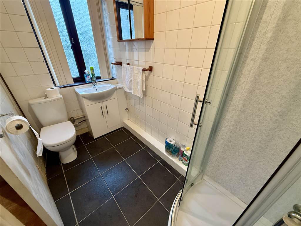Walk in shower and towel radiator, fully tiled walls, white suite consisting of low flush w.c and sink.