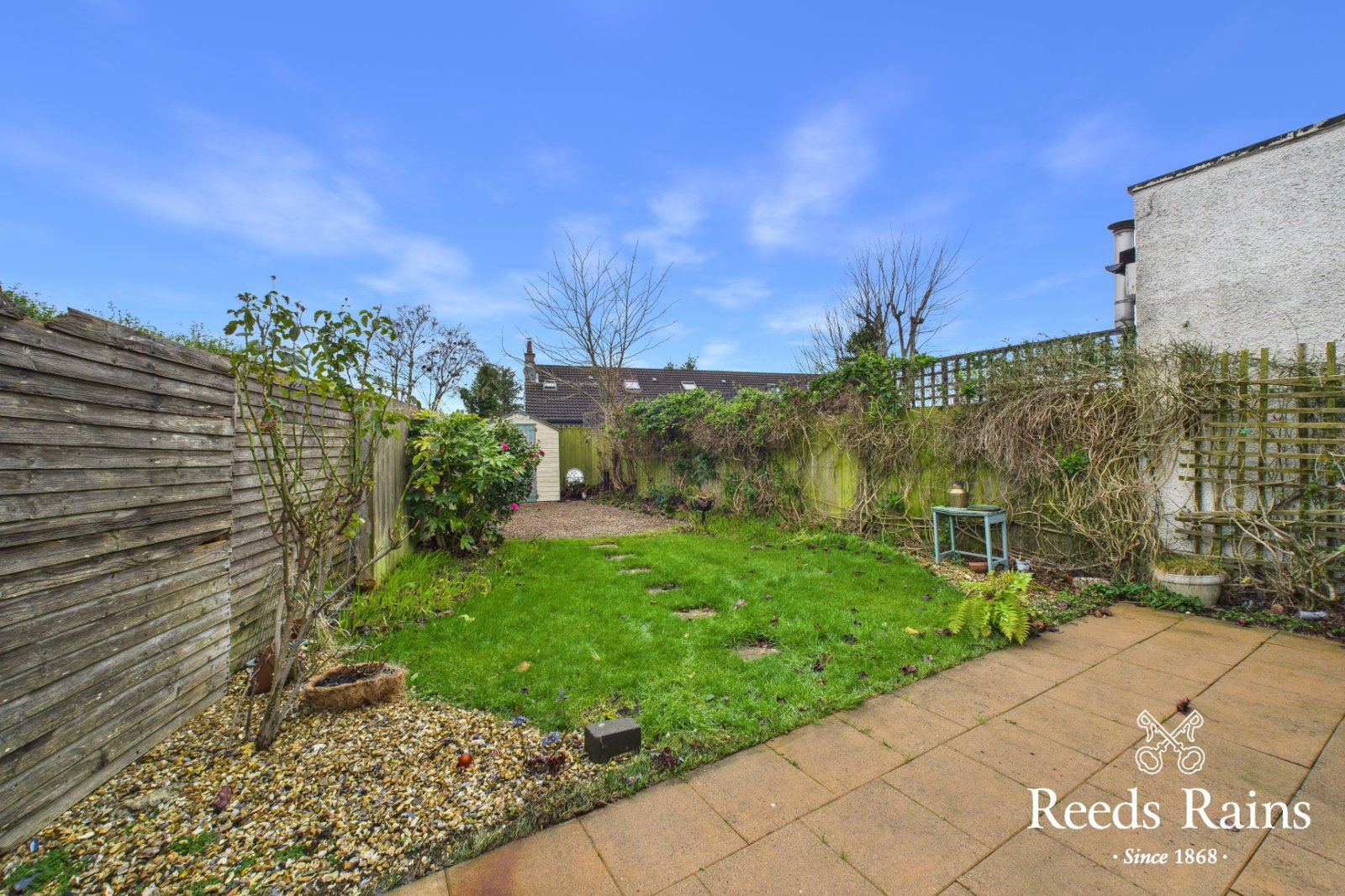 Ample driveway car parking for 3+ cars. Well tended garden to front in loose stones and shrubbery. Side access. Enclosed private easy to maintain garden to rear bordered by fencing in lawn, shrubbery, flower beds, loose stones and paved patio area. Garden shed. Outside tap / light.