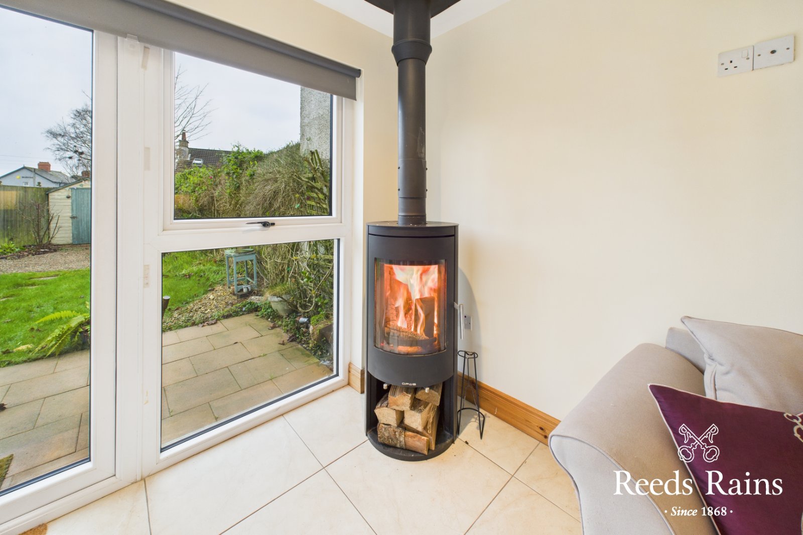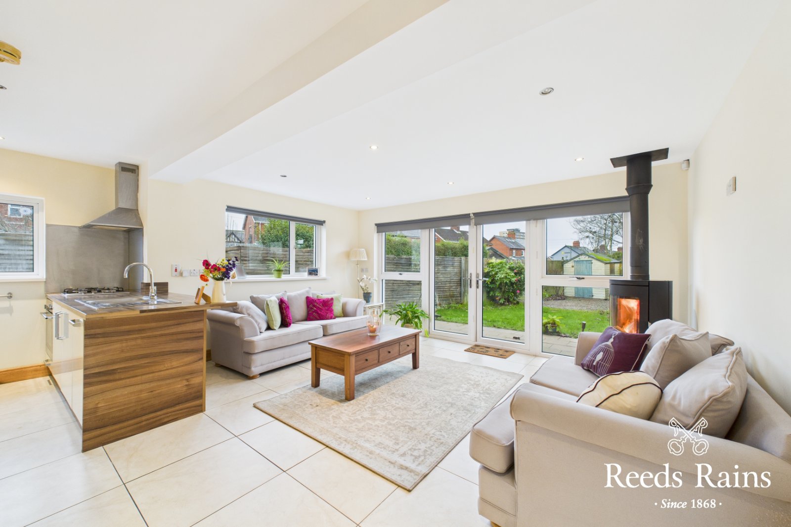 At widest points. One and 1/2 bowl sink unit with chrome dual mixer tap. Excellent range of high and low level soft closing units with stainless steel door furniture and wood effect work surfaces. Integrated four ring gas hob and built in oven with chimney extractor hood. Plumbed for washing machine. Integrated fridge / freezer. Integrated dishwasher. Recessed spotlighting. Ceramic tiled flooring. Feature cast iron wood burning stove. uPVC double doors to enclosed rear garden.