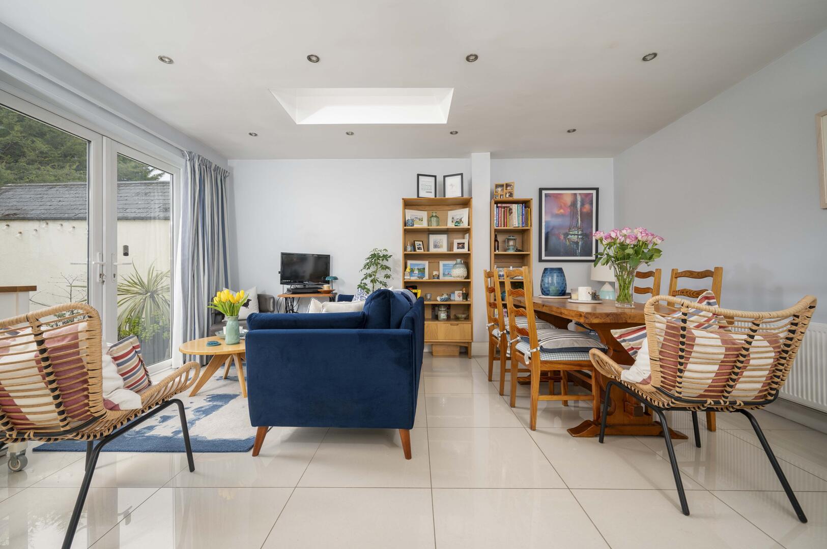 Kitchen with excellent range of high and low level units, stainless steel fittings, laminate worktop, stainless steel sink and a half and chrome mixer tap, integrated double oven, integrated dishwasher, integrated fridge freezer, four ring stainless steel gas hob, stainless steel extractor hood above, glass splashback, low voltage recessed spotlighting, open to living and dining, skylight with Velux window, uPVC double glazed French doors leading to rear garden, uPVC double glazed access door to rear garden.
