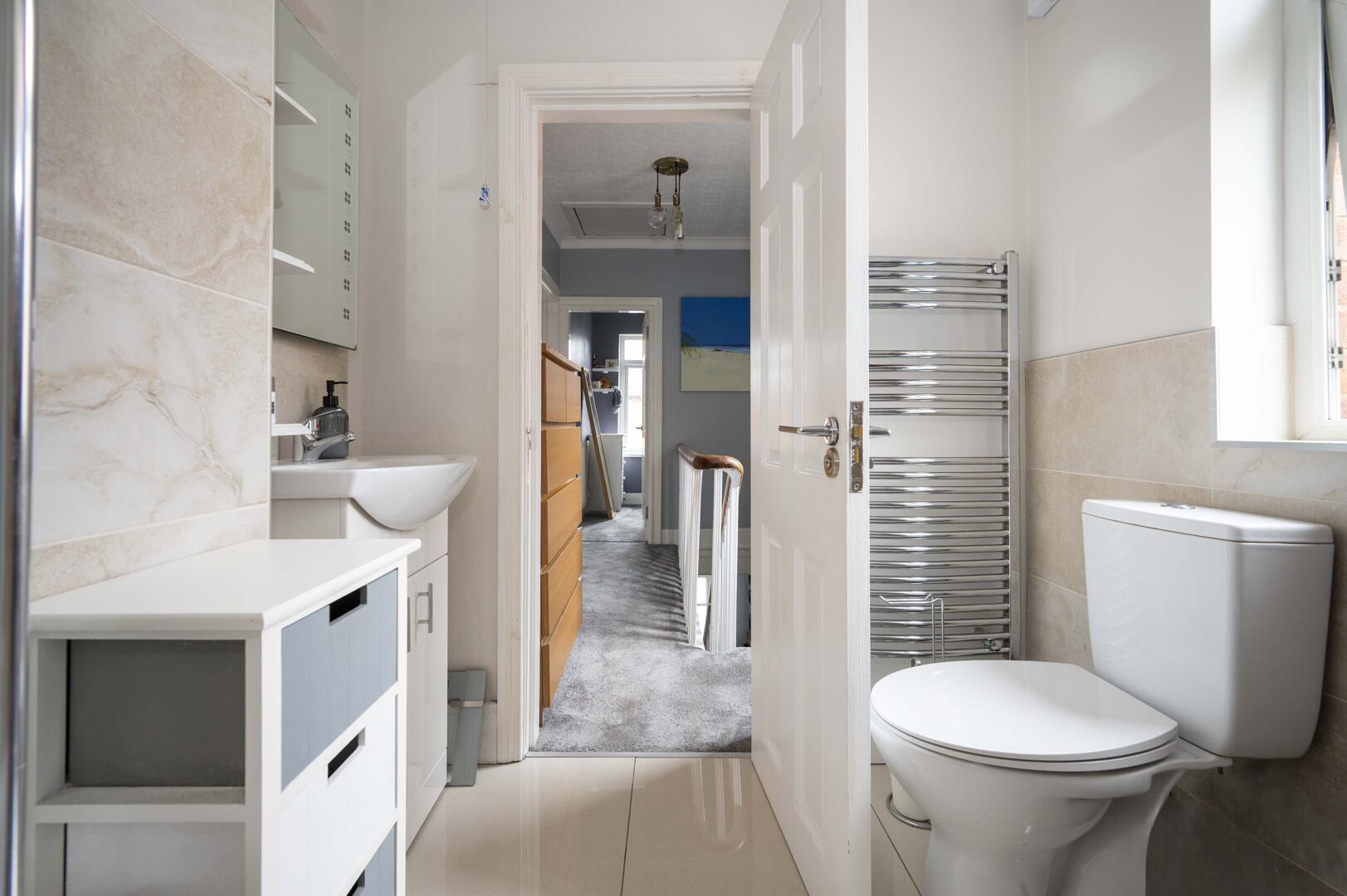 Modern white suite comprising low flush WC with push button, vanity unit with chrome mixer taps, tiled splashback, fully tiled bath with thermostatically controlled valve and telephone hand unit, low voltage recessed spotlighting, ceramic tiled floor, frosted glass window, chrome heated towel rail, extractor fan.